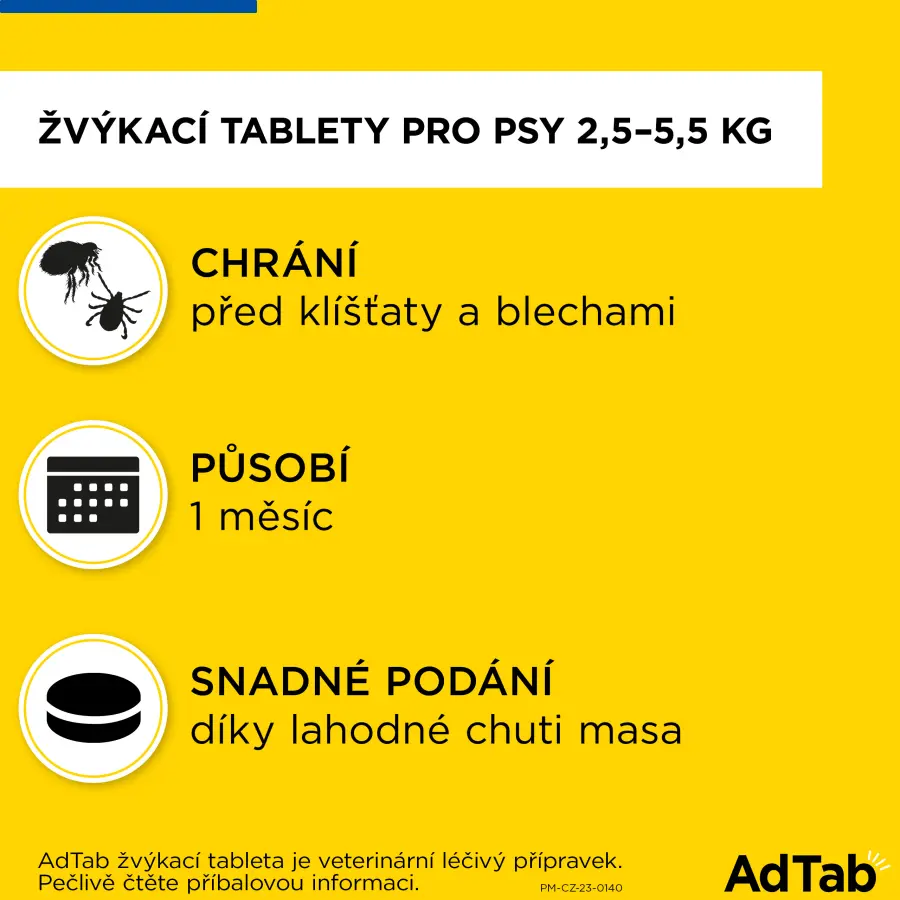 AdTabžvýkací tableta je veterinární léčivý přípravek, údaje vychází ze schválenéhoSPC (Souhrnu údajů o přípravku). Pečlivě čtěte příbalovou informaci.AdTab, Elanco, Elanco logo-šikmý pruh jsou obchodní značky ve vlastnictvíspolečnosti Elanco nebo jejích obchodních poboček. E-mail:veterina_cz@elancoah.com ©2023 PM-CZ-23-0145