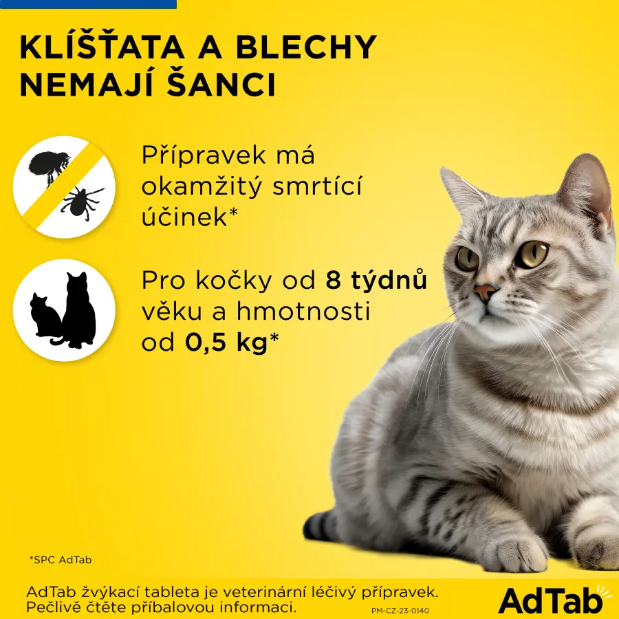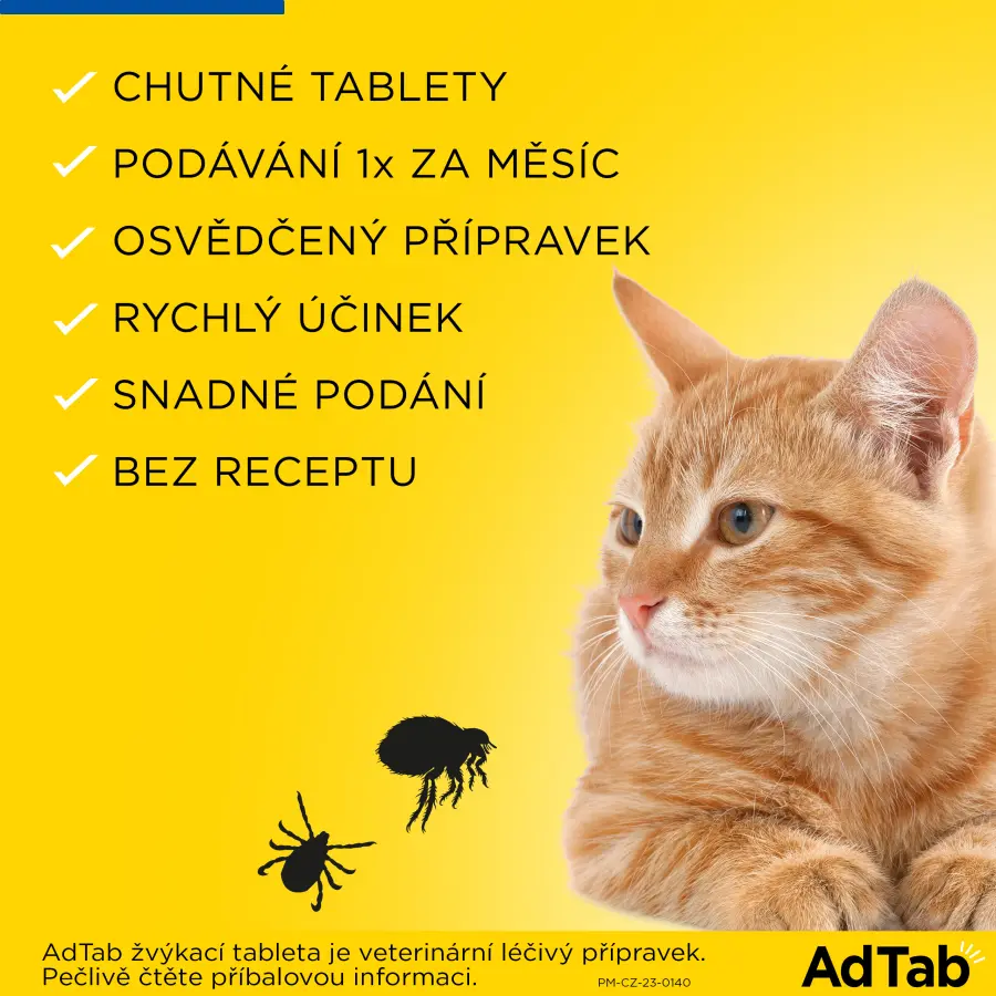 AdTab je malá žvýkací vanilkou ochucená tableta pro kočky s rychlým nástupem účinku, která vaší kočce poskytne ochranu před blechami a klíšťaty. Rovněž k léčbě napadení blechami a klíšťaty u koček. Tento veterinární léčivý přípravek má okamžitý smrtící účinek na blechy a klíšťata, který trvá 1 měsíc. Od stejného výrobce osvědčených značek Advantage® a Foresto®.