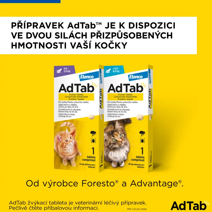AdTab žvýkací tableta je veterinární léčivý přípravek, údaje vychází ze schváleného SPC (Souhrnu údajů o přípravku). Pečlivě čtěte příbalovou informaci. AdTab, Elanco, Elanco logo-šikmý pruh jsou obchodní značky ve vlastnictví společnosti Elanco nebo jejích obchodních poboček. E-mail: veterina_cz@elancoah.com ©2023 PM-CZ-23-0145