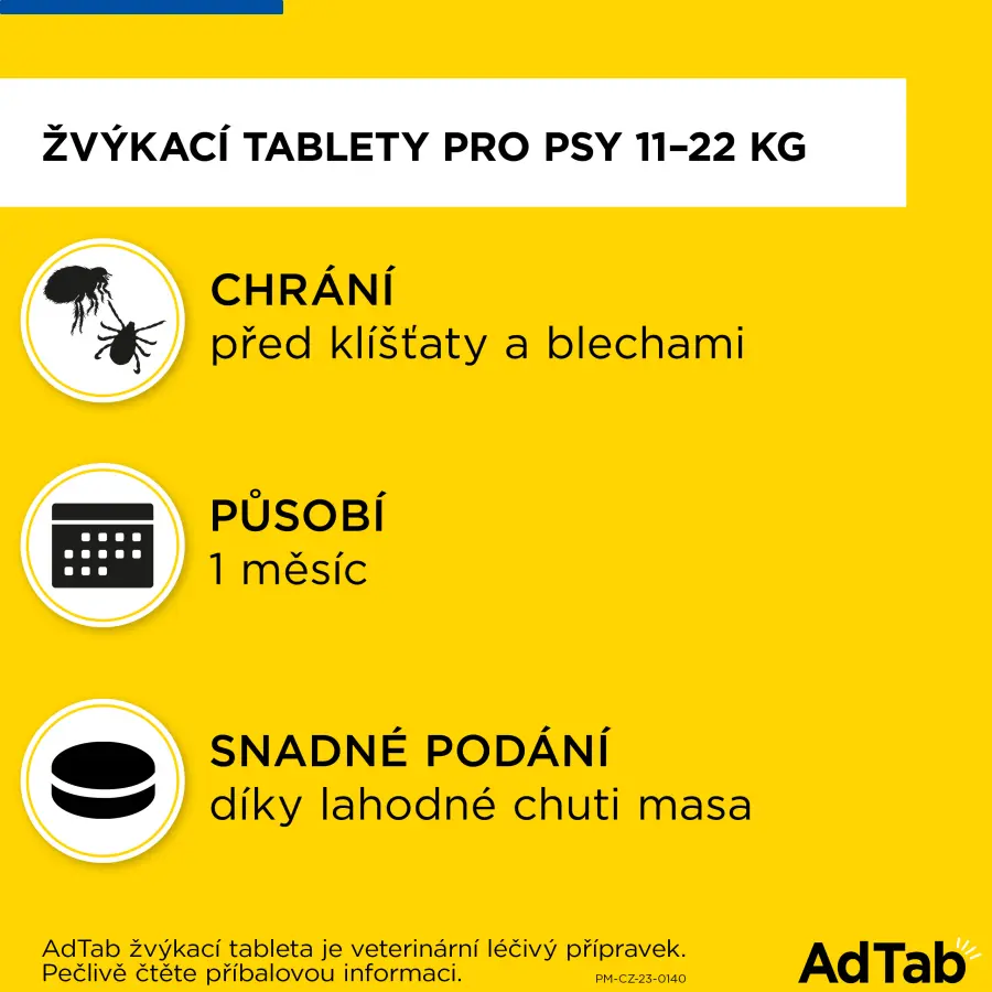Váš pes si zamiluje masovou příchuť tablet AdTab – jedna tableta měsíčně jej ochrání před blechami a klíšťaty. Tablety AdTab podávejte s krmivem nebo po krmení, aby byla zajištěna maximální účinnost. Pro dosažení optimální kontroly proti napadení blechami a klíšťaty je vhodné přípravek AdTab podávat jednou měsíčně.