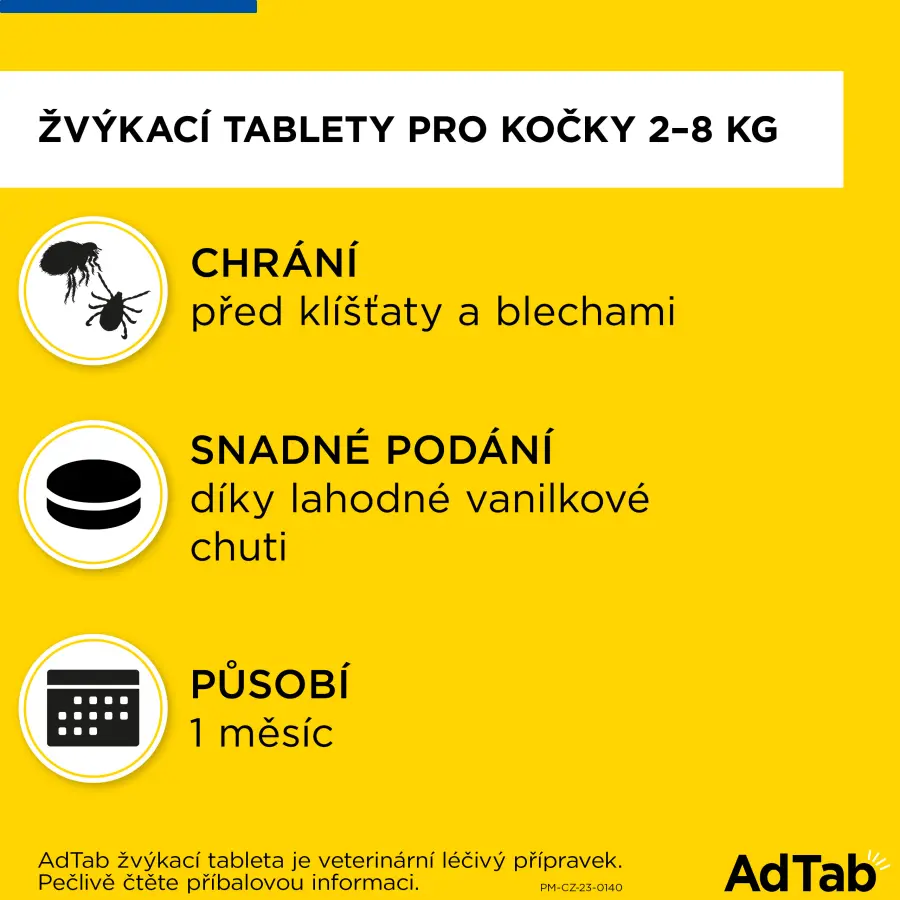 AdTab je malá žvýkací vanilkou ochucená tableta pro kočky s rychlým nástupem účinku, která vaší kočce poskytne ochranu před blechami a klíšťaty. Rovněž k léčbě napadení blechami a klíšťaty u koček. Tento veterinární léčivý přípravek má okamžitý smrtící účinek na blechy a klíšťata, který trvá 1 měsíc. Od stejného výrobce osvědčených značek Advantage® a Foresto®.