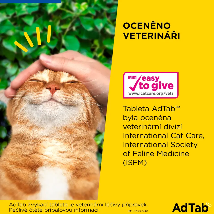 AdTab žvýkací tableta je veterinární léčivý přípravek, údaje vychází ze schváleného SPC (Souhrnu údajů o přípravku). Pečlivě čtěte příbalovou informaci. AdTab, Elanco, Elanco logo-šikmý pruh jsou obchodní značky ve vlastnictví společnosti Elanco nebo jejích obchodních poboček. E-mail: veterina_cz@elancoah.com ©2023 PM-CZ-23-0145