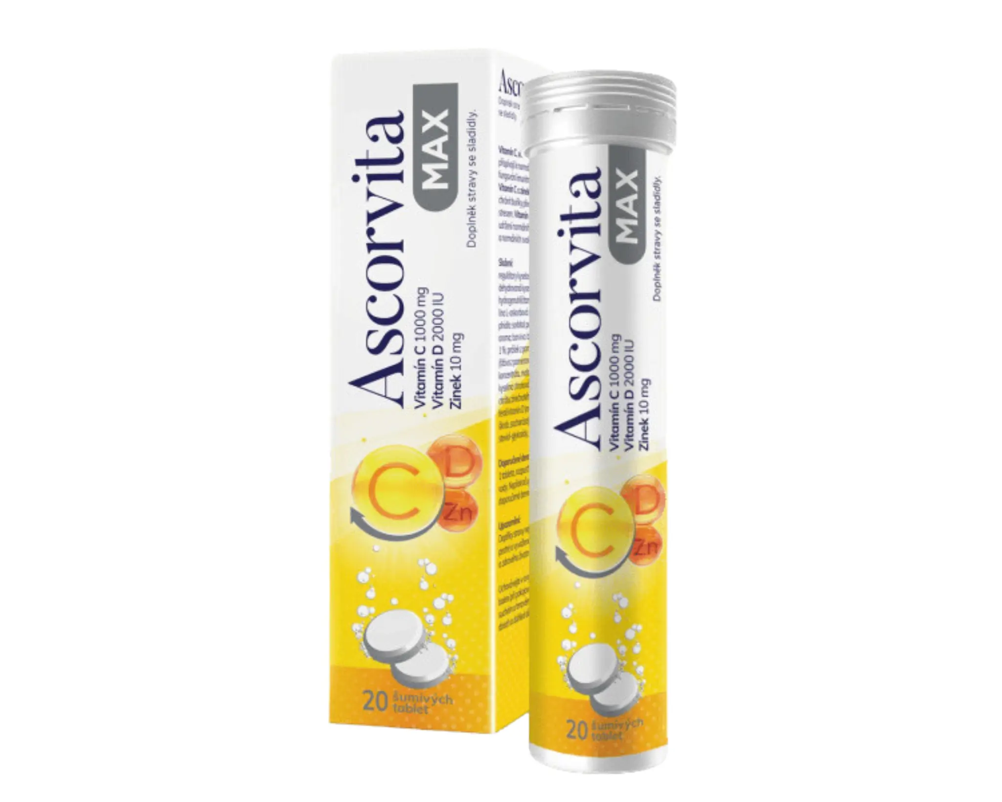 Ascorvita Max jsou šumivé tablety k přípravě nápoje s citrusovou příchutí s obsahem vitamínu C, D a zinkem pro podporu imunity. K přípravě nápoje s citrusovou příchutí. Vitamíny C, D a zinek přispívají k normální funkci imunitního systému. Vitamín C (1000 mg) přispívá ke snížení míry únavy a vyčerpání, k normální tvorbě kolagenu pro normální funkci chrupavek a krevních cév. Vitamín D3 (2000 IU) podporuje udržení normálního stavu kostí, zubů a normální činnosti svalů. Zinek (10 mg) přispívá k udržení normálního stavu zraku, kostí, pokožky, vlasů a nehtů. Doporučuje se užívat při zvýšené potřebě vitaminu C, D a zinku, zejména při únavě, oslabené imunitě nebo zvýšené fyzické a psychické zátěži. Vhodné jako prevence nedostatku vitaminu C, D a zinku.
