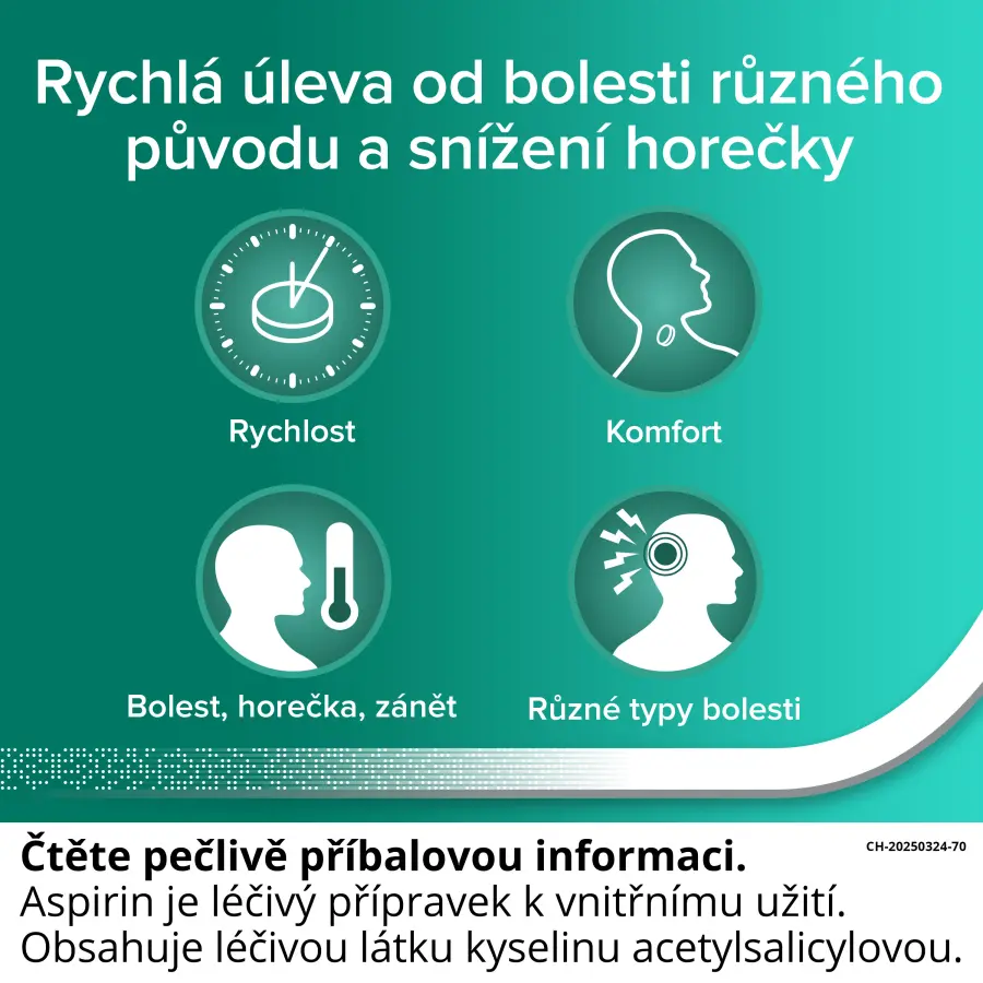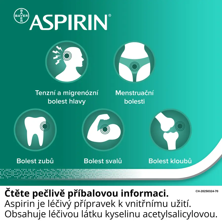 Aspirin je volně prodejný léčivý přípravek. Aspirin přináší rychlou úlevu od bolestí různého původu a horečky, a to díky speciálně navržené formě tablet. Aspirin obsahuje léčivou látku kyselinu acetylsalicylovou. Kyselina acetylsalicylová účinkuje jako analgetikum (ulevuje od bolesti), antipyretikum (snižuje horečku) a působí protizánětlivě. Přípravek Aspirin se používá k symptomatické léčbě horečky a/nebo mírné až středně silné bolesti, jako je bolest hlavy (tenzní i migrenozní), bolest kloubů, bolest zubů nebo svalů, menstruační bolest. Technologie výroby tablet usnadňuje vstřebání léčivé látky do krevního oběhu a tím také zajištuje rychlejší nástup účinku. Aspirin je určen pro dospělé a dospívající od 12 let věku (a vážící 40 kg a více).