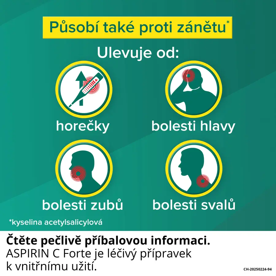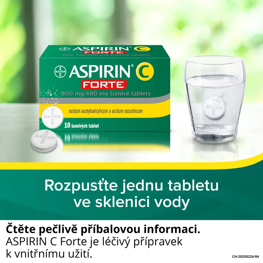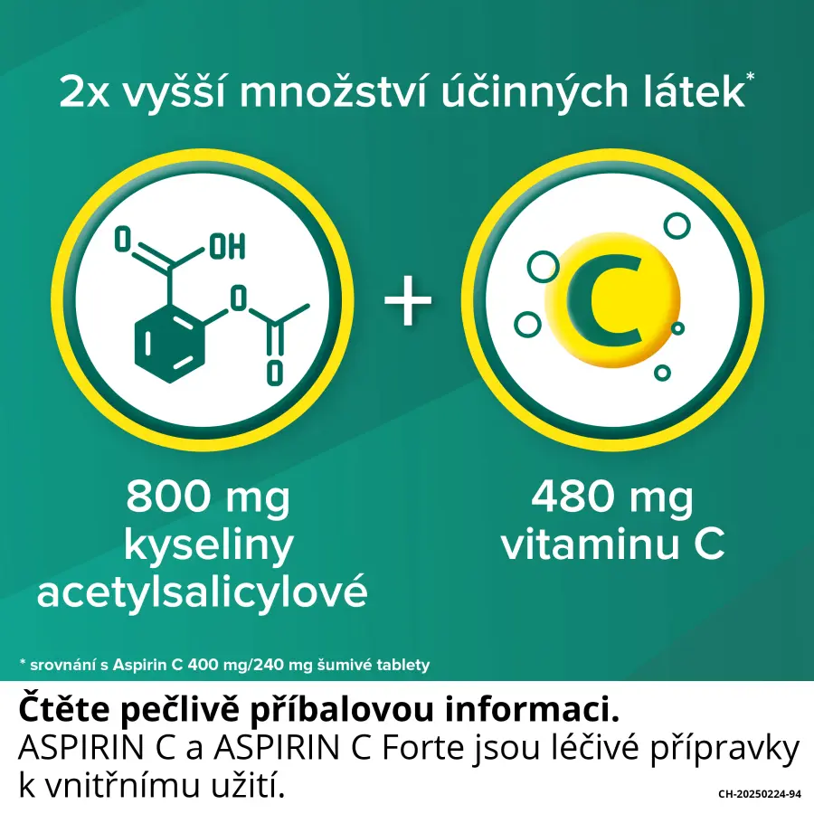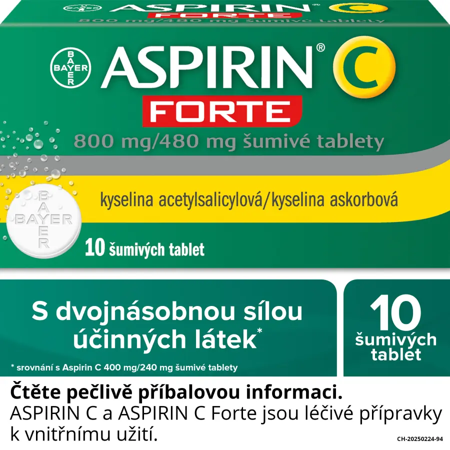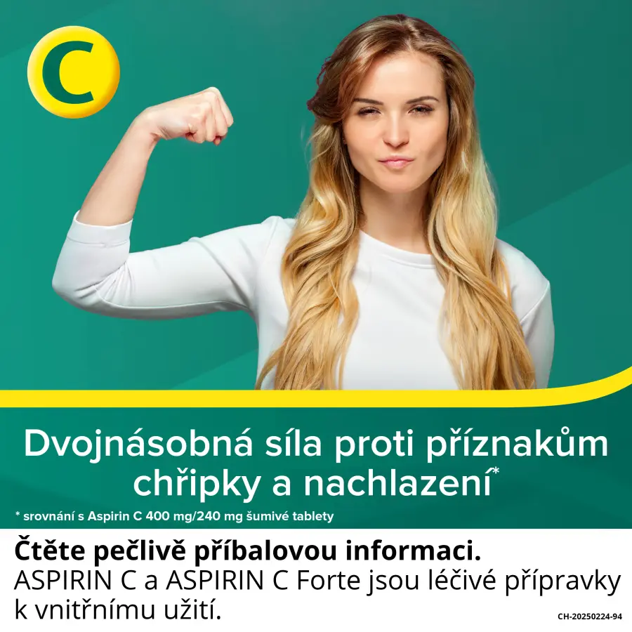 Aspirin C Forte je kombinovaný lék ve formě šumivých tablet a obsahuje 2x vyšší množství účinných látek než Aspirin C. Jedna tableta obsahuje 800 mg kyseliny acetylsalicylové a 480 mg kyseliny askorbové, lépe známé jako vitamin C, pro účinnou úlevu od prvních příznaků nachlazení, ale i kdykoli v průběhu nemoci nebo při bolesti. Aspirin C Forte má analgetické, protizánětlivé a také antipyretické vlastnosti. Léčivý přípravek působí proti příznakům podobným chřipce nebo nachlazení, jako je: