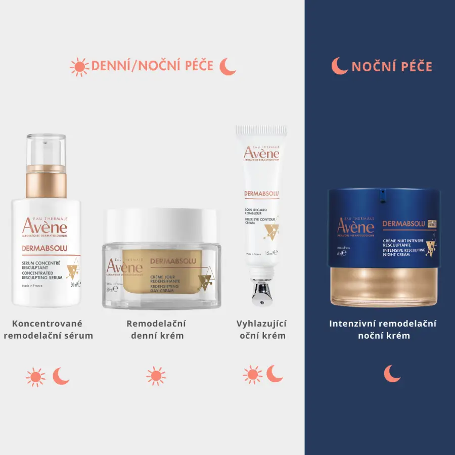 Avène DermAbsolu Intenzivní remodelační noční krém dodává pleti hladký a mladistvý vzhled bez podráždění. Toto pokročilé složení využívá sílu přírody k omlazení stárnoucí pleti. Nově definuje kontury obličeje. Bakuchiol poskytuje srovnatelné výsledky jako retinol s lepší kožní snášenlivostí. Pro-ceramidy a niacinamid vyživují a obnovují vitalitu jemné pleti. Osvěžující gelové složení krému rychle proniká do pokožky a dodává jí pokročilé pečující látky.