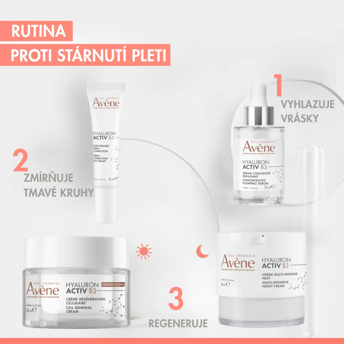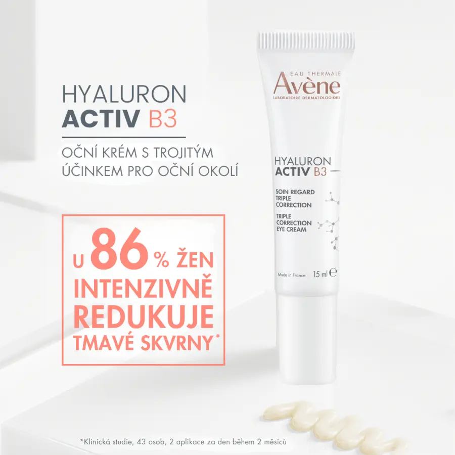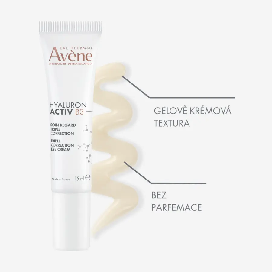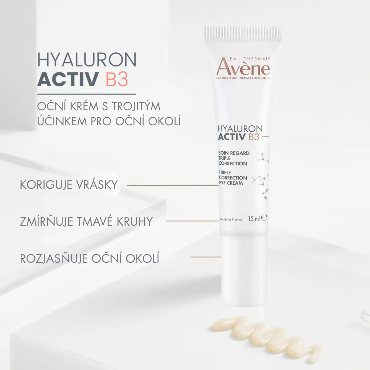 Avène Hyaluron Activ B3 oční krém s trojitým účinkem obsahuje niacinamid, čistou kyselinu hyaluronovou a dextran sulfát. Zmírňuje kruhy a váčky pod očima, vyhlazuje vrásky a přirozeně rozjasňuje oční partie a váš pohled.