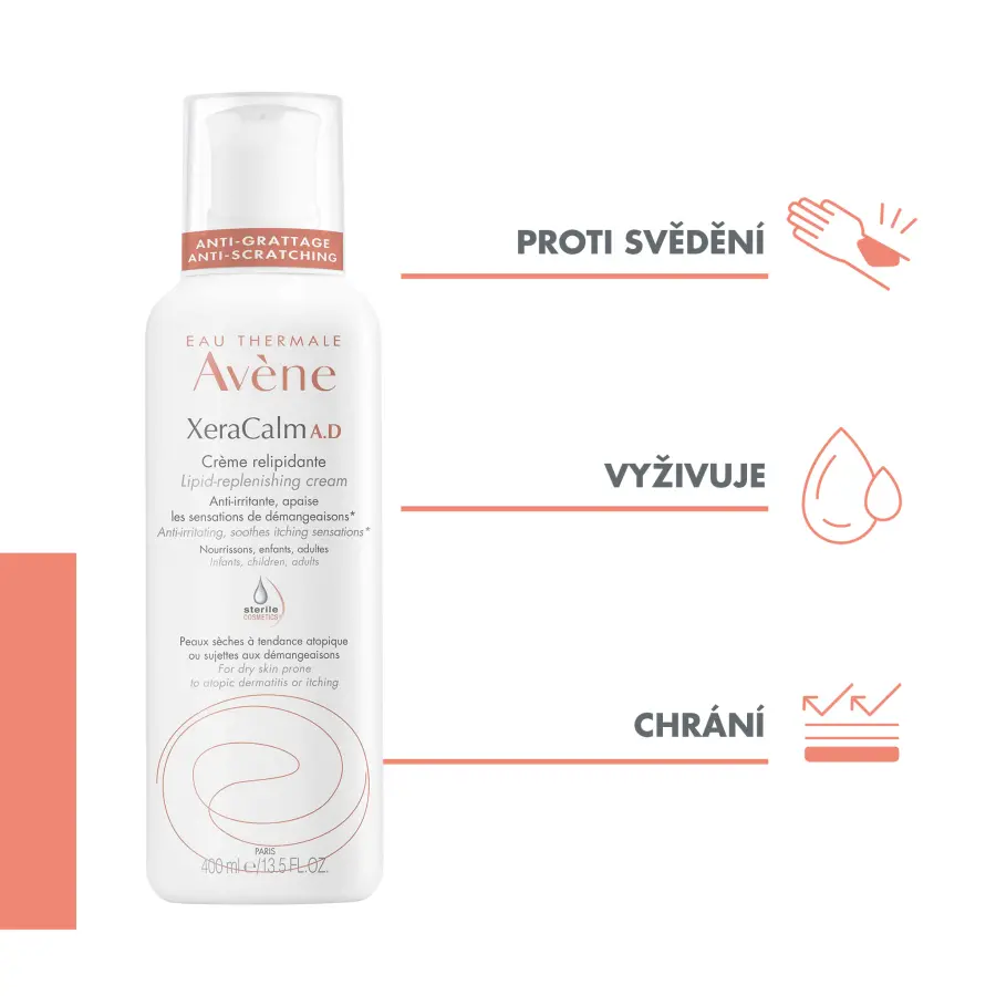 Avène XeraCalm A.D Relipidační krém s praktickou sterilní pumpou poskytuje okamžitou úlevu od svědění, zmírňuje zarudnutí a zklidňuje podráždění suché kůže celé rodiny (kojenci, děti, dospělí) se sklonem k atopickému ekzému a svědění.Sterilní kosme