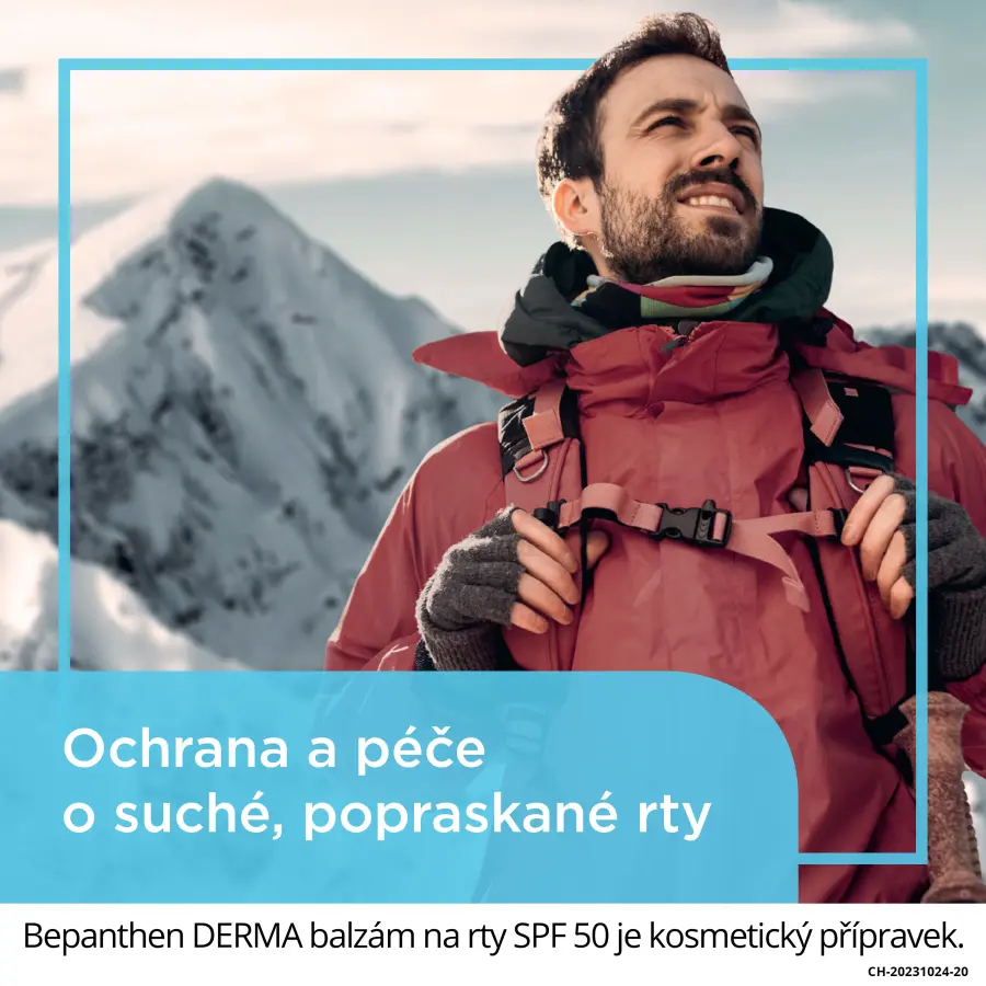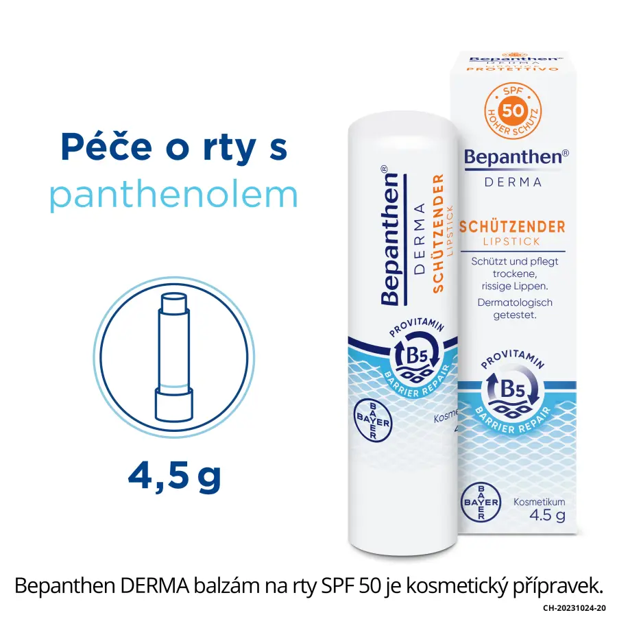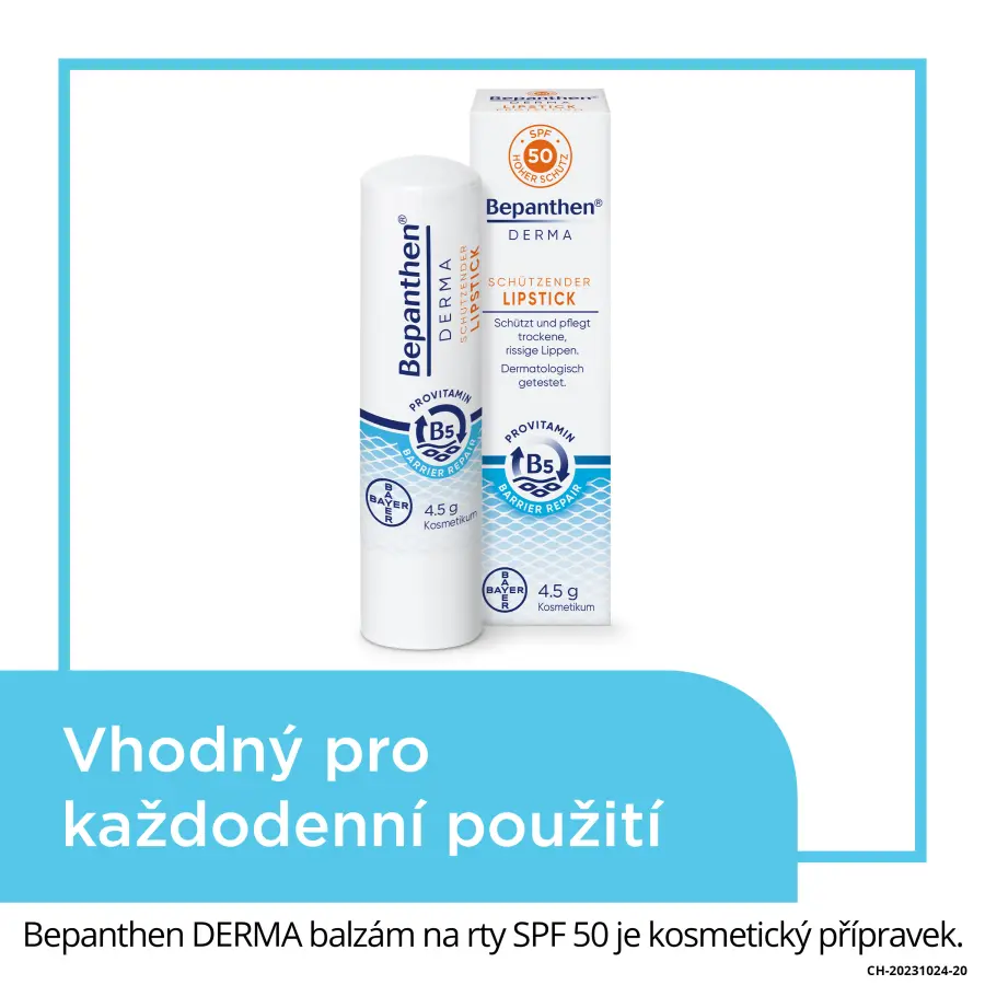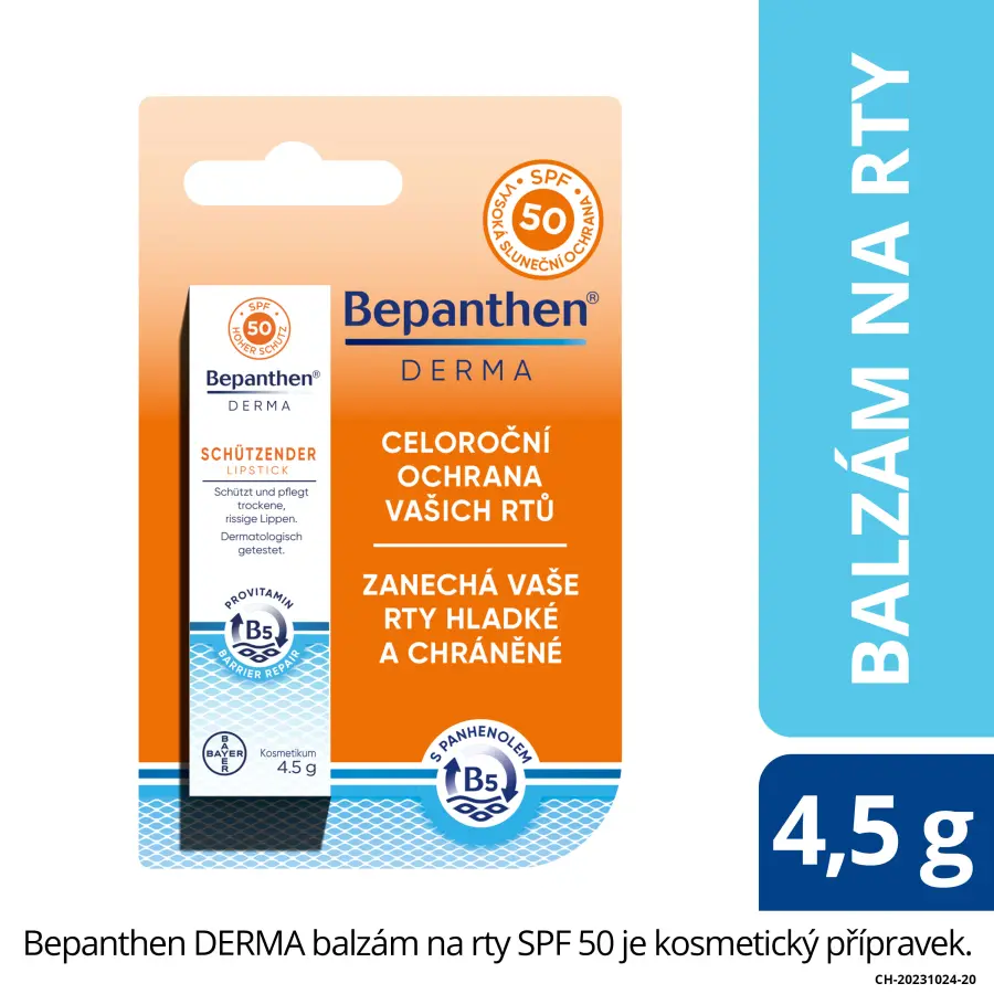 Bepanthen balzám na rty SPF 50 pečuje o suché a popraskané rty a chrání je před slunečním UVA a UVB zářením. S obsahem panthenolu, včelího vosku a vitaminu E pro regeneraci a hydrataci rtů. Pro každodenní použití.