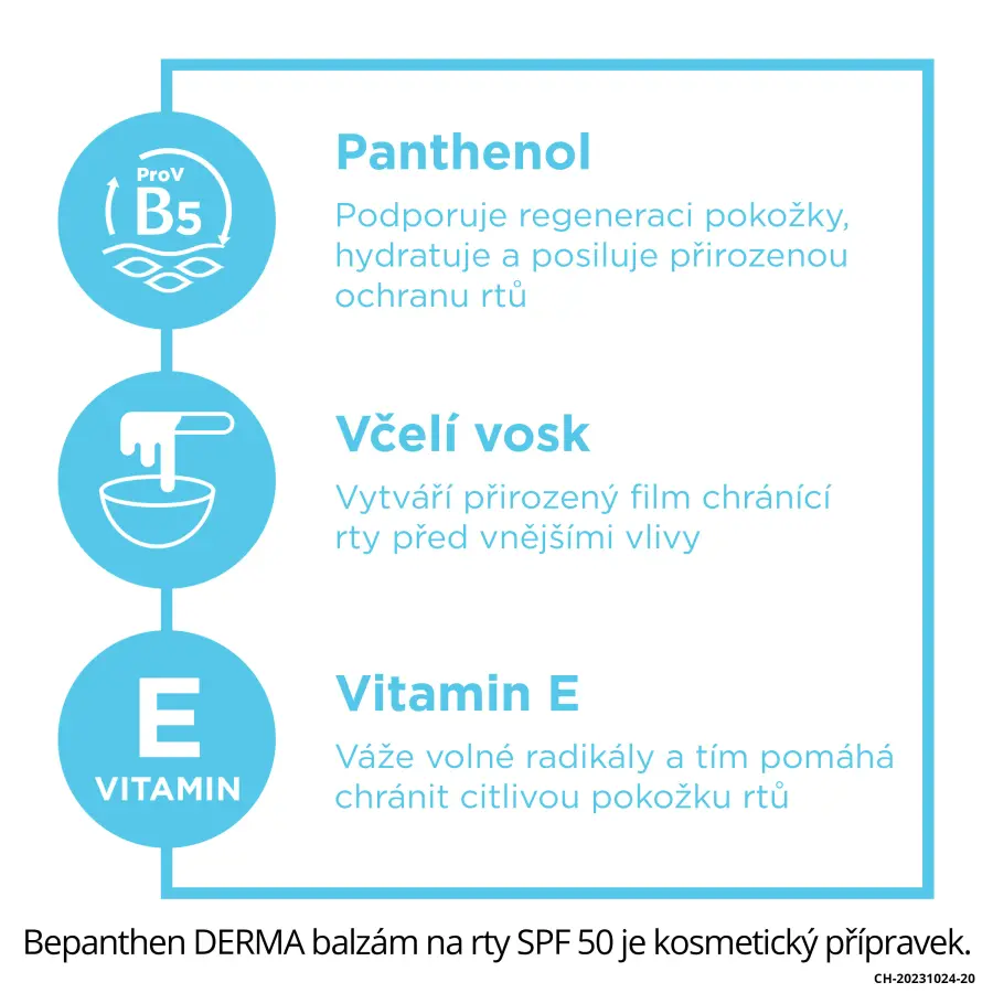 Bepanthen balzám na rty SPF 50 pečuje o suché a popraskané rty a chrání je před slunečním UVA a UVB zářením. Složení s obsahem panthenolu, včelího vosku a vitaminu E pro regeneraci a hydrataci rtů. Balzám je vhodný pro každodenní použití.
