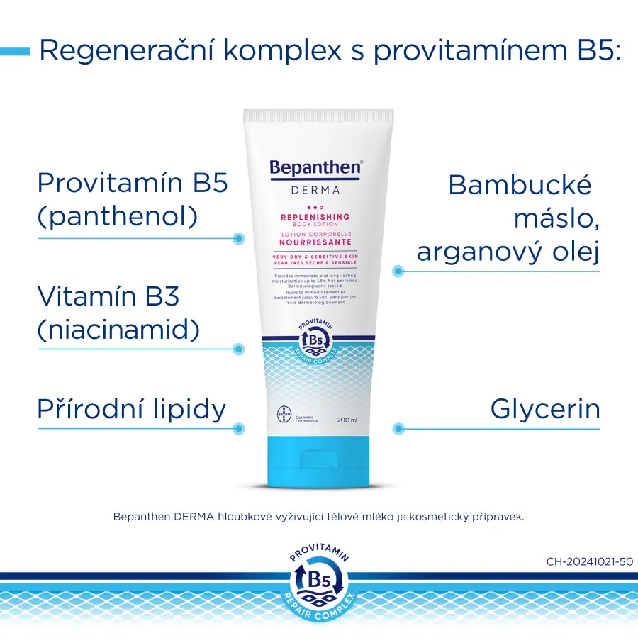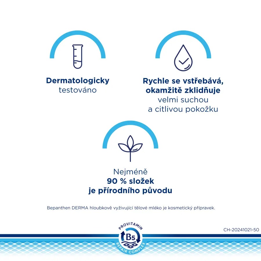 Bepanthen Derma hloubkově vyživující tělové mléko poskytuje okamžitou a dlouhotrvající hydrataci po dobu až 48 hodin. Zklidňuje pnutí pokožky a zanechává ji jemnou a sametově hebkou. Je vhodný k použití pro celou rodinu. Můžete jej používat každý den na velmi suchou a citlivou pokožku.Přírodní lipidy (např. bambucké máslo nebo arganový olej) - doplňují chybějící lipidy v pokožce Glycerol - látka, která přirozeně váže vodu v pokožce. Poskytuje okamžitou a dlouhotrvající hydrataci. Pro velmi suchou a citlivou pokožku Okamžitá úleva pro suchou pokožku Okamžitý zklidňující účinek na pokožku Rychlá absorpce Vyživuje a hloubkově hydratuje, pro jemnou a hladkou pokožku Pro každodenní použití Dermatologicky testováno Šetrný k mikroflóře pokožky