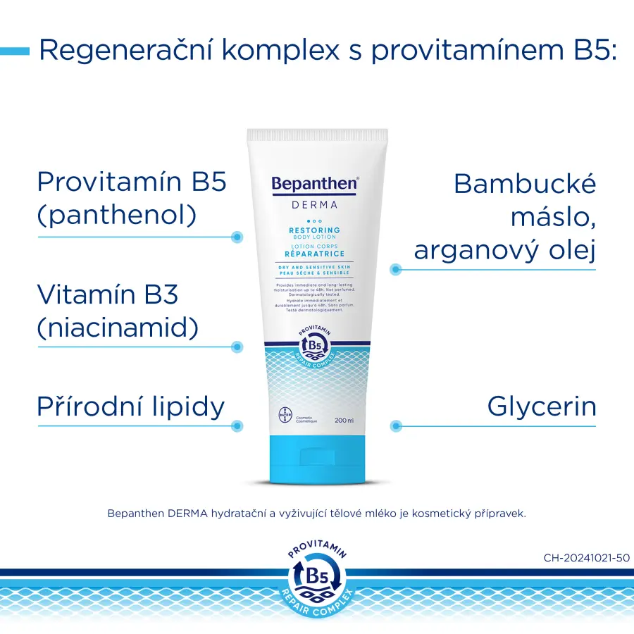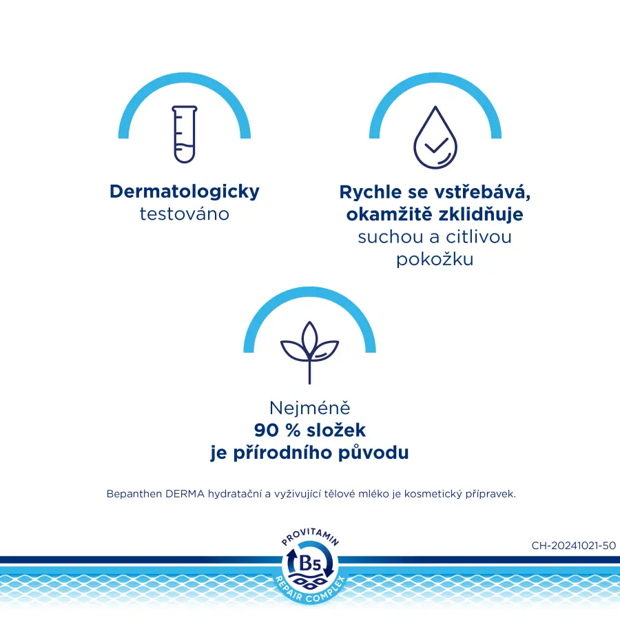 Tělové mléko Bepanthen Derma bylo vyvinuto tak, aby poskytovalo okamžitou hydrataci suché a citlivé pokožce po dobu až 48 hodin díky obnovujícímu komplexu s provitamínem B5. Používejte každý den na suchou a citlivou pokožku. Bepanthen Derma hydratační a vyživující tělové mléko nejen rychle zmírňuje pnutí suché pokožky, ale také poskytuje dlouhotrvající péči a zanechává pokožku jemnou a hladkou na dotek. Složky obsažené v tělovém mléku Bepanthen Derma a obnovující komplex s provitamínem B5, pronikají do kůže a působí v jejích hlubokých vrstvách:
