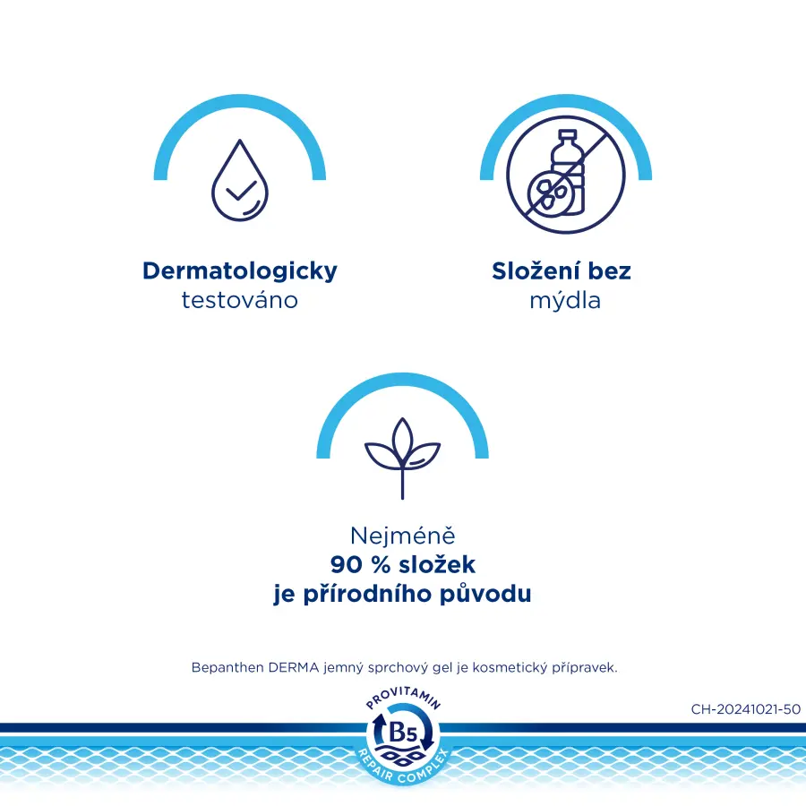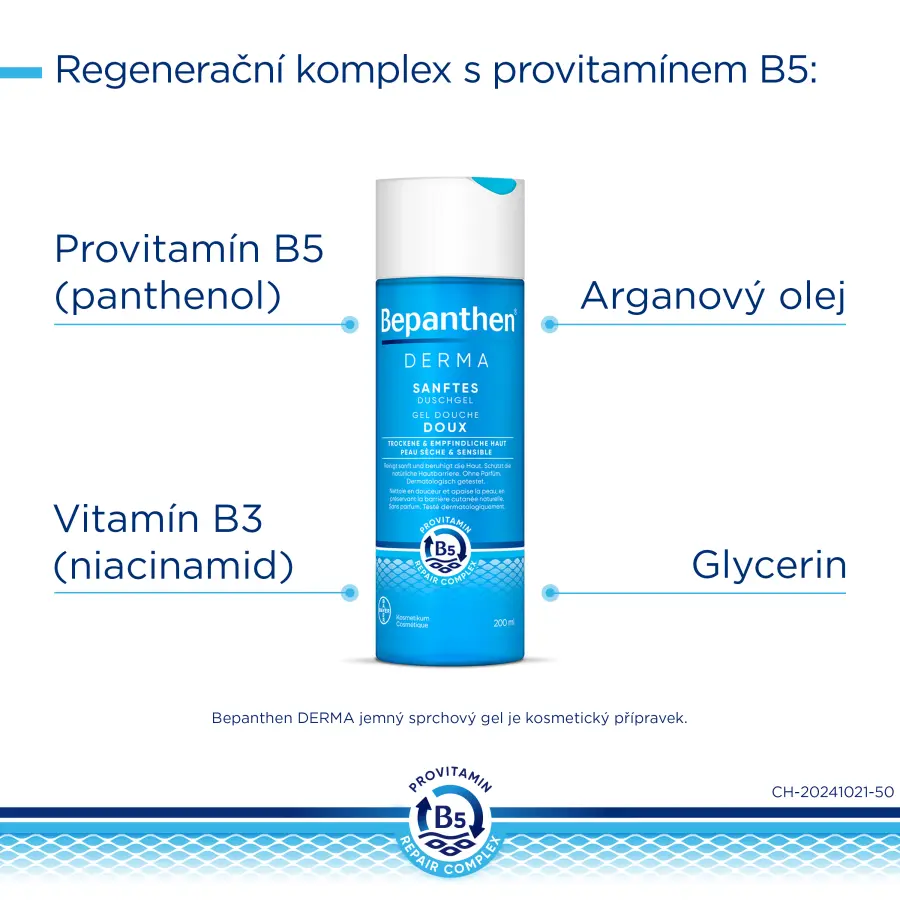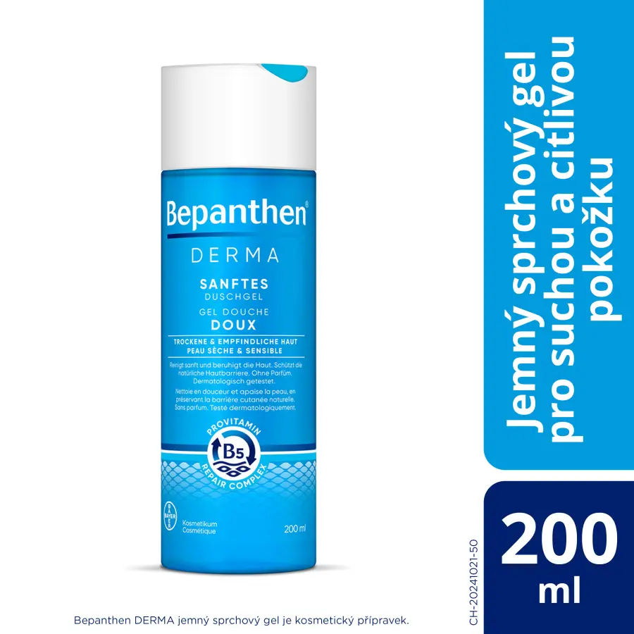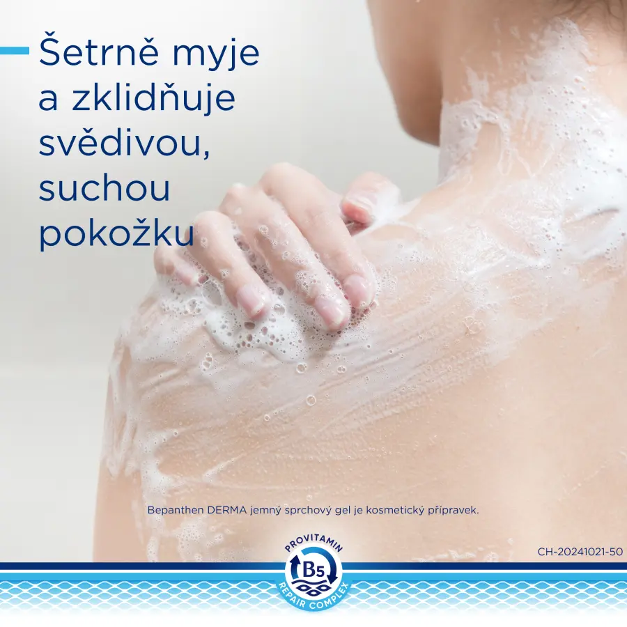 Bepanthen Derma je jemný sprchový gel, který šetrně myje suchou pokožku tím, že vytváří jemnou čisticí pěnu, aniž by poškozoval přirozenou ochrannou vrstvu pokožky. Okamžitě zmírňuje pocit pnutí a zklidňuje suchou pokožku. Poskytuje pocit svěžesti a čistoty, snadno se oplachuje. Zanechává pokožku hladkou a pružnou. Vybrané složky obnovujícího komplexu s provitamínem B5 pronikají do hlubokých vrstev pokožky a hloubkově ji hydratují zevnitř, a to i při mytí: