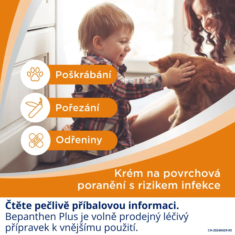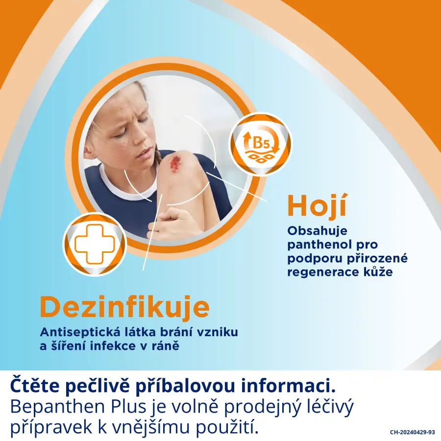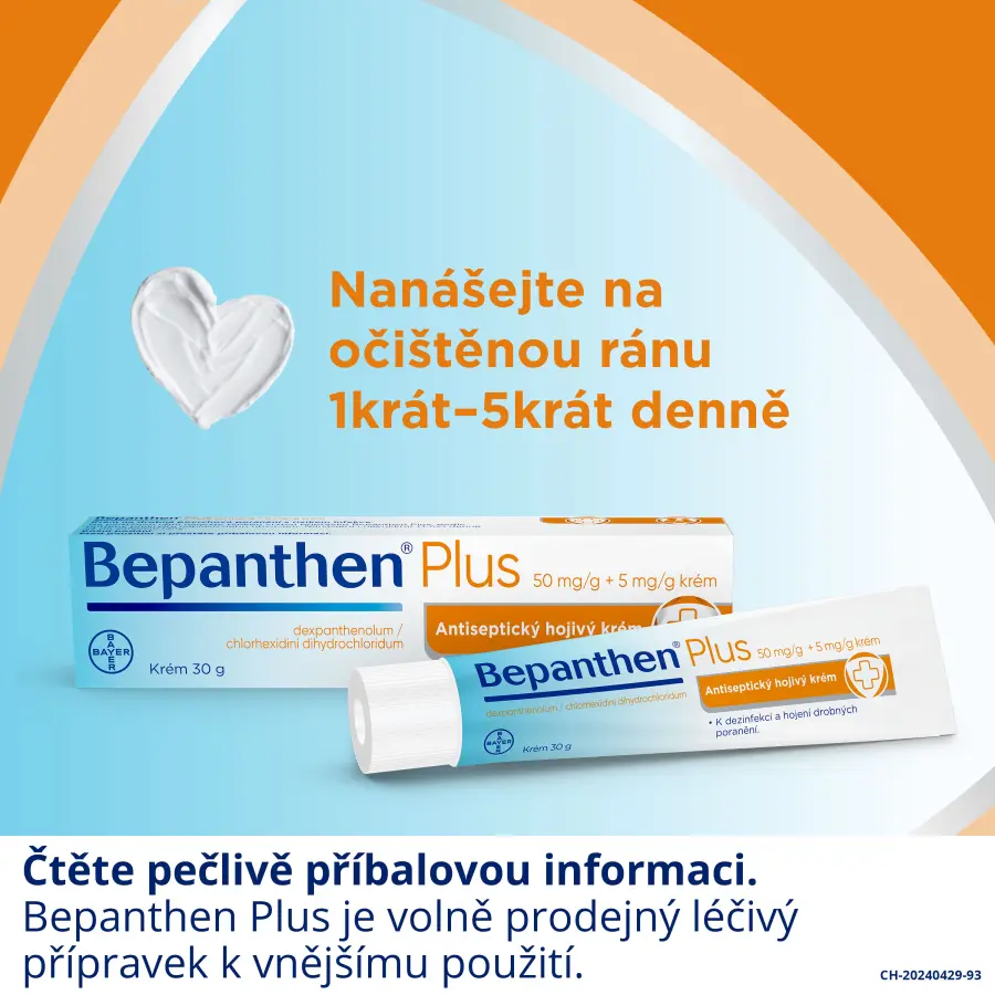 Bepanthen Plus je hojivý krém vhodný k ošetření drobných povrchových poranění kůže. Dezinfikuje a hojí různé typy ran s rizikem infekce, jako jsou odřeniny, řezné rány, oděrky, otlaky, lehké popáleniny a další. Po poradě s lékařem se dále používá k léčbě chronických stavů, jako jsou bércové vředy a proleženiny, k léčbě kožních infekcí a po drobných chirurgických zákrocích. Podporuje hojení ran a rychle se vstřebává. Bepanthen Plus obsahuje dvě léčivé látky. Dexpanthenol podporuje tvorbu a regeneraci kůže. Antiseptická látka chlorhexidin zabraňuje šíření mikrobů na povrchu ran. Tím brání vzniku a šíření infekce v ráně.