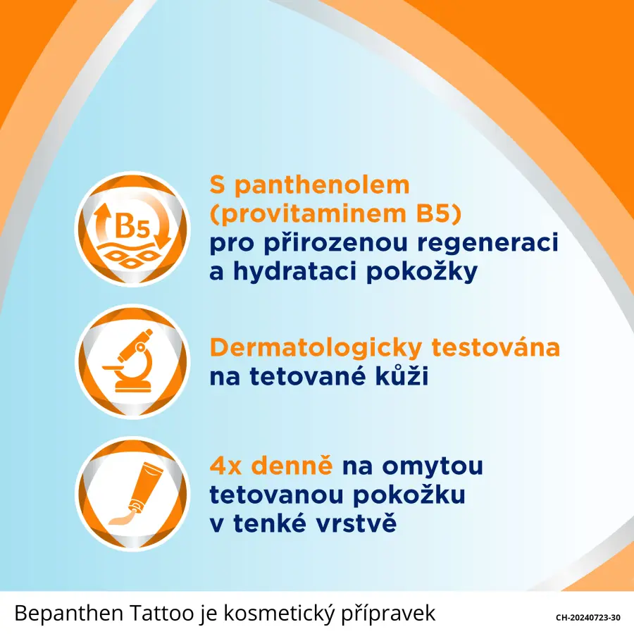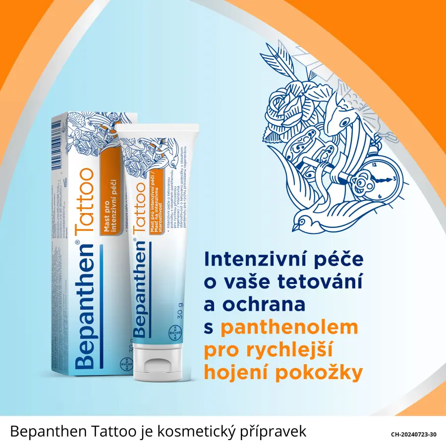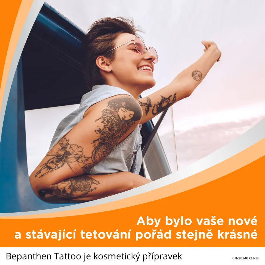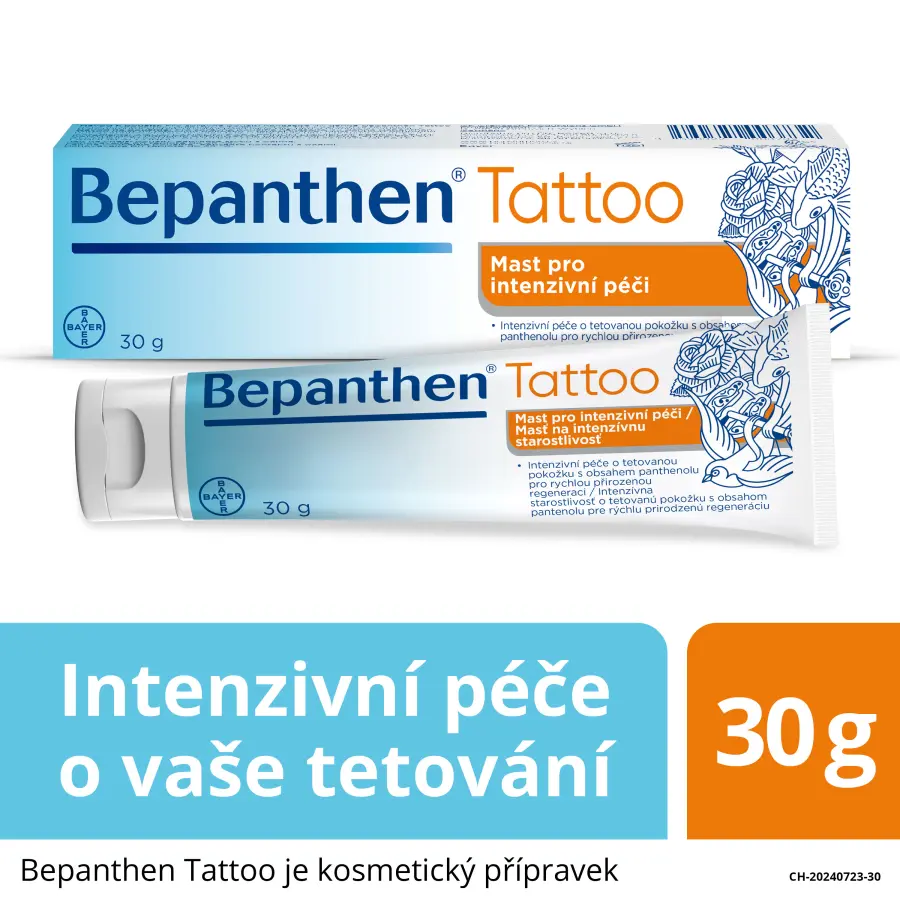 Bepanthen Tattoo mast je určena pro péči o tetovanou pokožku. Péče o vaše tetování by měla začít hned, jakmile se necháte tetovat. Bepanthen Tattoo receptura s panthenolem (provitamin B5) vytváří přirozenou a prodyšnou ochrannou vrstvu, která poskytuje úroveň vlhkosti potřebnou k tomu, aby pokožka mohla regenerovat zevnitř a stabilizovala přirozenou funkci kožní bariéry.
