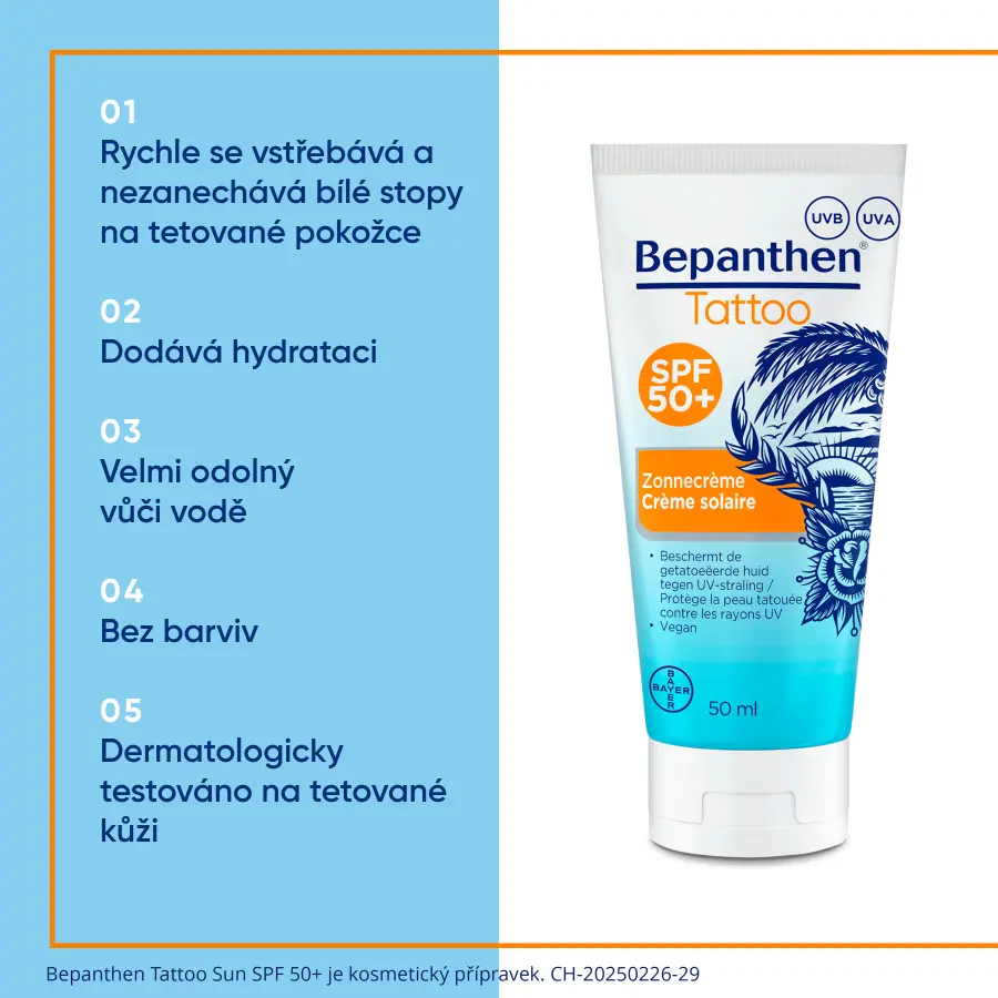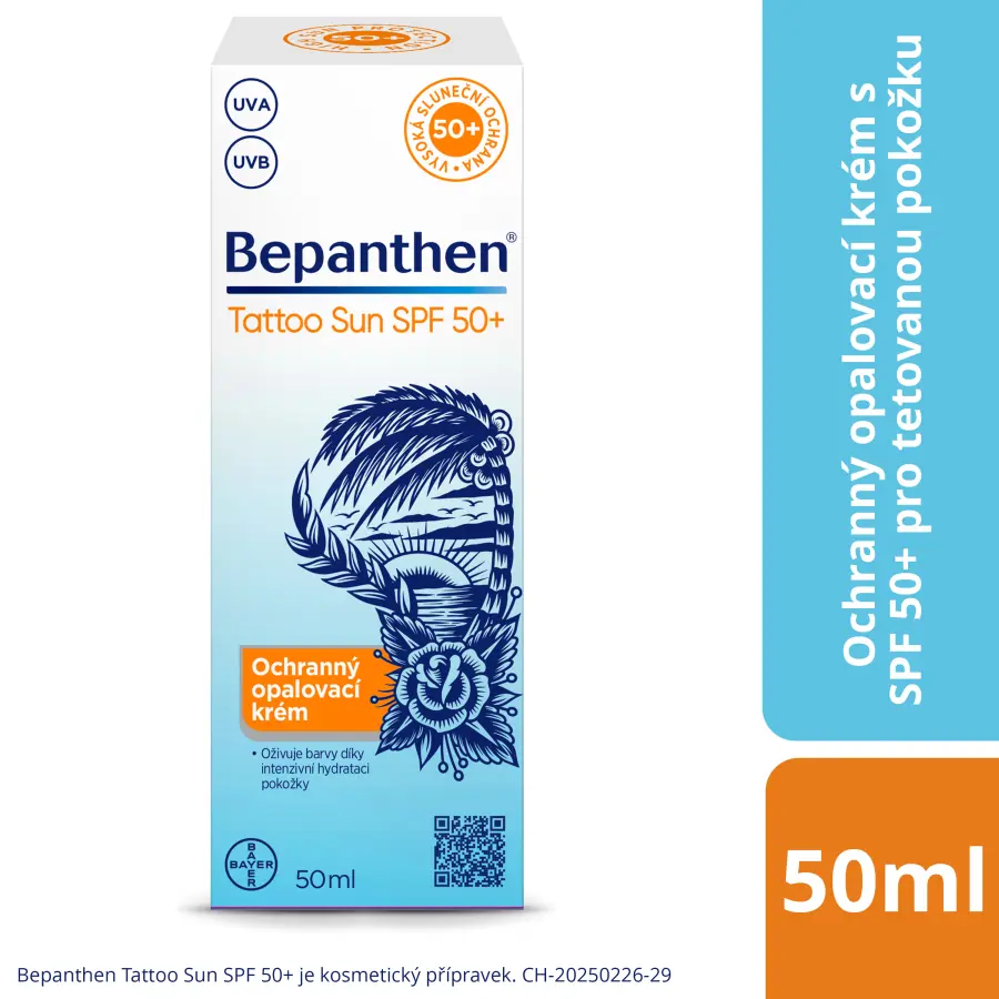 Bepanthen Tattoo Sun SPF 50+ je ochranný opalovací krém na tetovanou pokožku. Chrání ji před UVA/UVB zářením. Rychle se vstřebává, pomáhá posilovat přirozenou kožní bariéru pokožky a nezanechává na pokožce bílé stopy. Je velmi odolný vůči vodě. Sluneční nebo UV záření může poškodit vaše tetování. Chraňte je před sluncem. Bepanthen Tattoo Sun SPF 50+, ochranný opalovací krém na tetování, chrání tetovanou pokožku před UVA/UVB zářením. Rychle se vstřebává a nezanechává na ní bílé stopy . Obsahuje panthenol, který podporuje vlastní regenerační proces pokožky a stabilizuje přirozenou funkci kožní bariéry. Dermatologicky testováno na tetované pokožce.