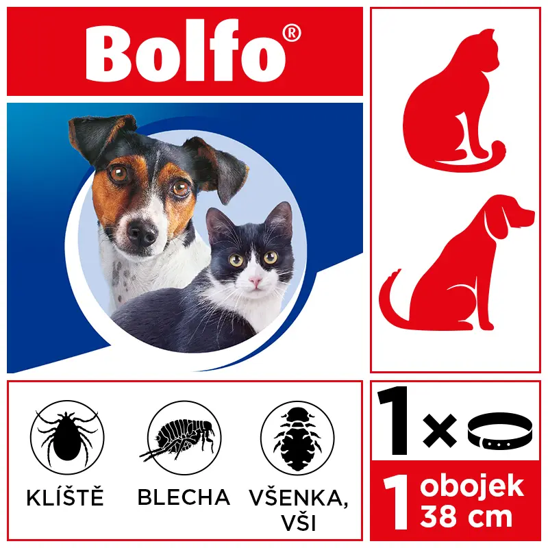 Bolfo obojek pro kočky a malé psy slouží jako prevence proti klíšťatům, blechám, vším a všenkám. Účinný proti blechám až na 5 měsíců, proti klíšťatům na 10 týdnů. Obojek je voděodolný a má bezpečnostní pojistku proti uškrcení.