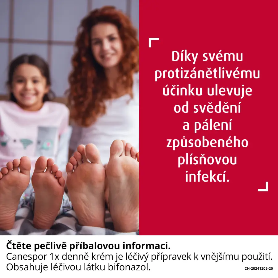 Canespor 1x denně krém efektivně léčí plíseň na nohou i na těle. Díky protizánětlivému účinku ulevuje od svědění a pálení způsobeného plísňovou infekcí.