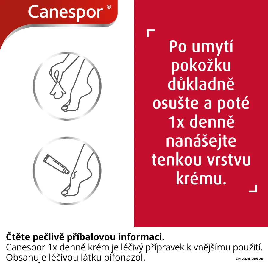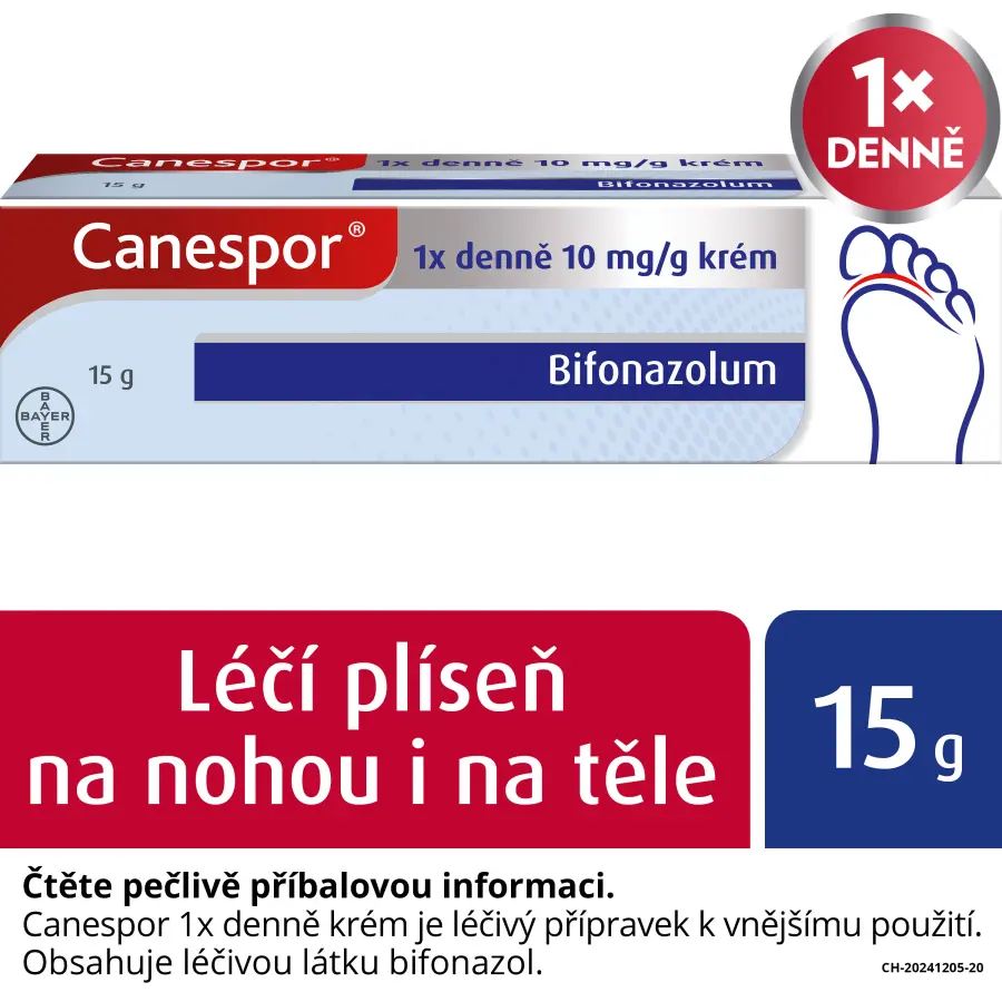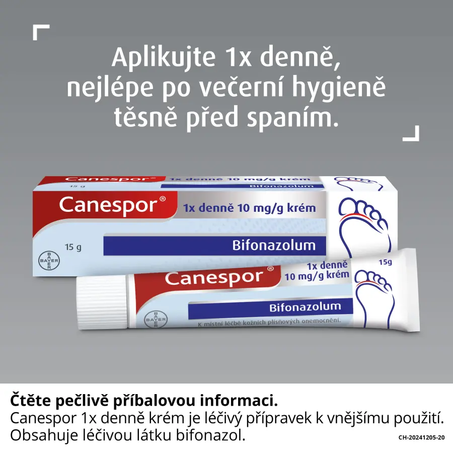 Canespor 1x denně krém efektivně a hlavně prakticky (aplikace 1× denně) léčí plísně (mykózy) na nohou (mezi prsty, vnější okraj chodidla, pata…), ale také na dalších částech těla. Přináší úlevu od nepříjemných projevů onemocnění díky protizánětlivému účinku. Eliminuje hlavní patogeny mykotických kožních infekcí. Canespor krém je účinné širokospektrální antimykotikum, které dobře proniká hluboko do infikovaných vrstev kůže. Léčivý přípravek Canespor 1x denně krém je nemastný bílý krém bez zápachu, který se snadno vstřebává do postižené kůže. Aplikuje se nejlépe po večerní hygieně těsně před spaním.
