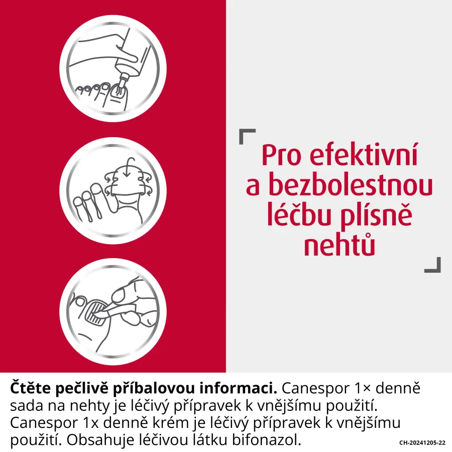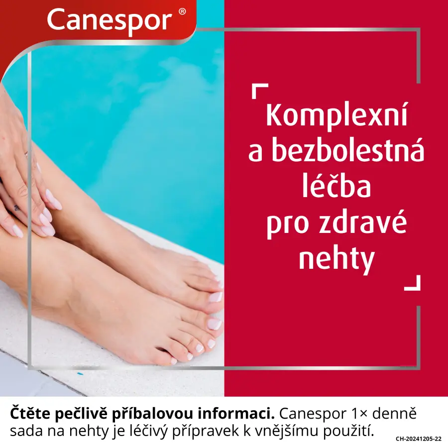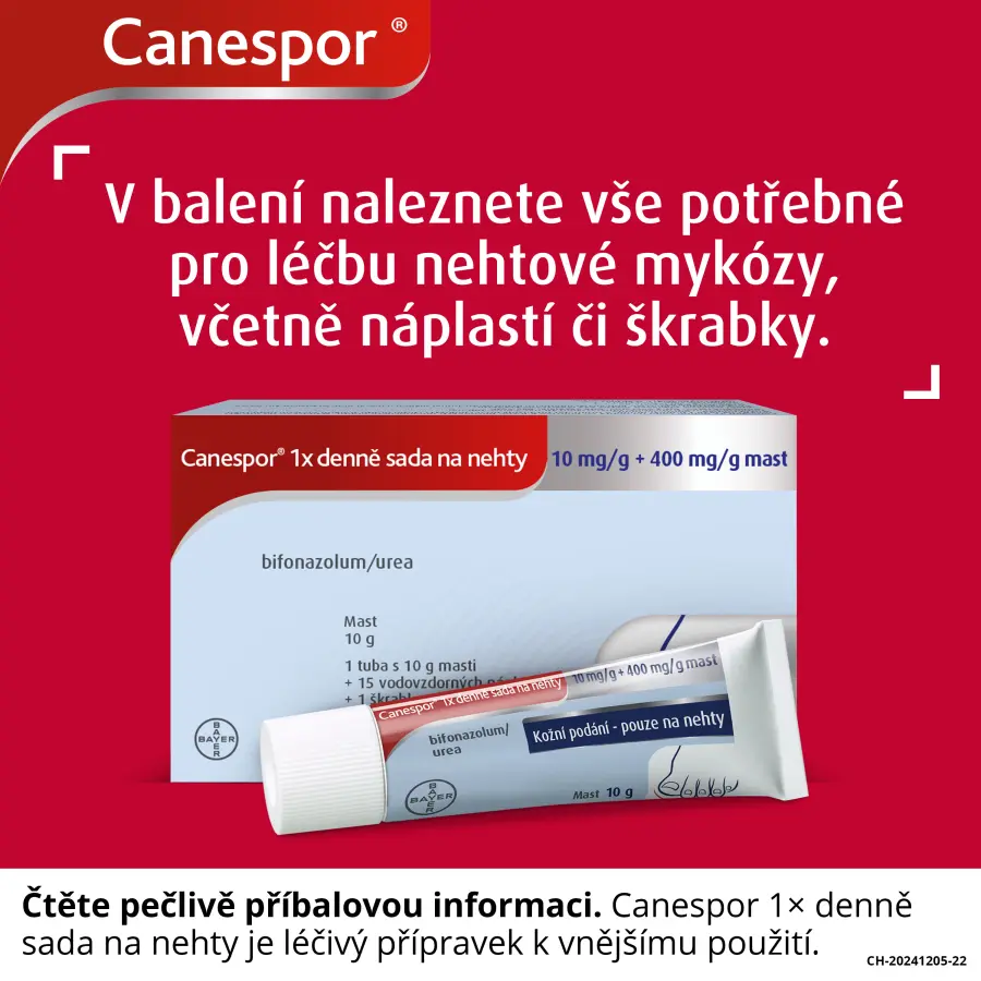 Canespor 1× denně sada na nehty účinně léčí plíseň nehtů na rukou a nohou. Komplexní a bezbolestná léčba pro zdravé nehty na 2 + 4 týdny. Obsahuje 2 účinné látky, jedna změkčuje postižený nehet a druhá proniká do postiženého místa a hubí původce plísní. Sada na nehty představuje kombinované balení, ve kterém je vše potřebné k léčbě nehtové mykózy. Obsahuje 10 g masti s dávkovačem, 15 voděodolných náplastí a škrabku na nehty. Způsob léčby přípravkem Canespor 1× denně sada na nehty je komfortní, protože mast se aplikuje pouze jednou denně. Mast je vhodné aplikovat večer po koupeli, protože postižený nehet se musí asi na 10 minut namočit do horké vody. Ošetřený nehet se na následujících 24 hodin překryje náplastí. Mast z této sady lze použít k lokální aplikaci na jiná mykózou postižená místa na těle.
