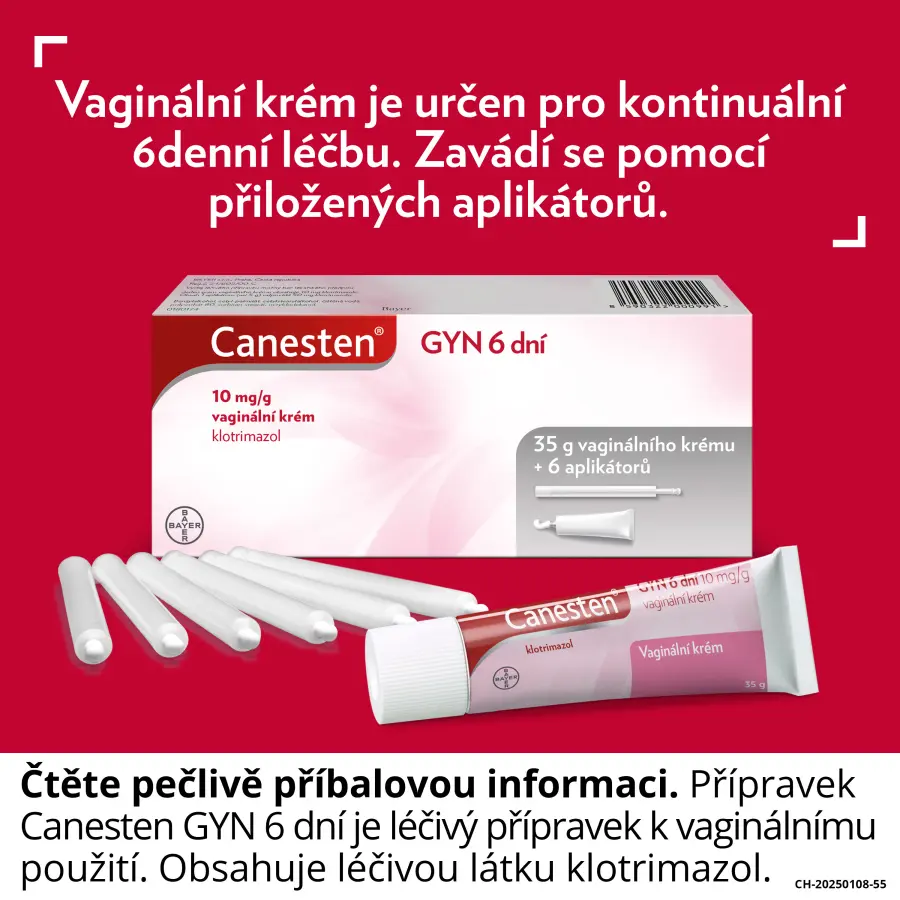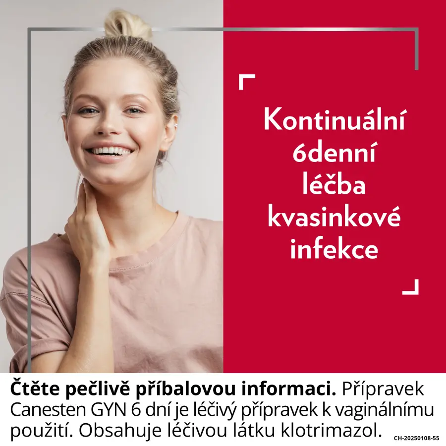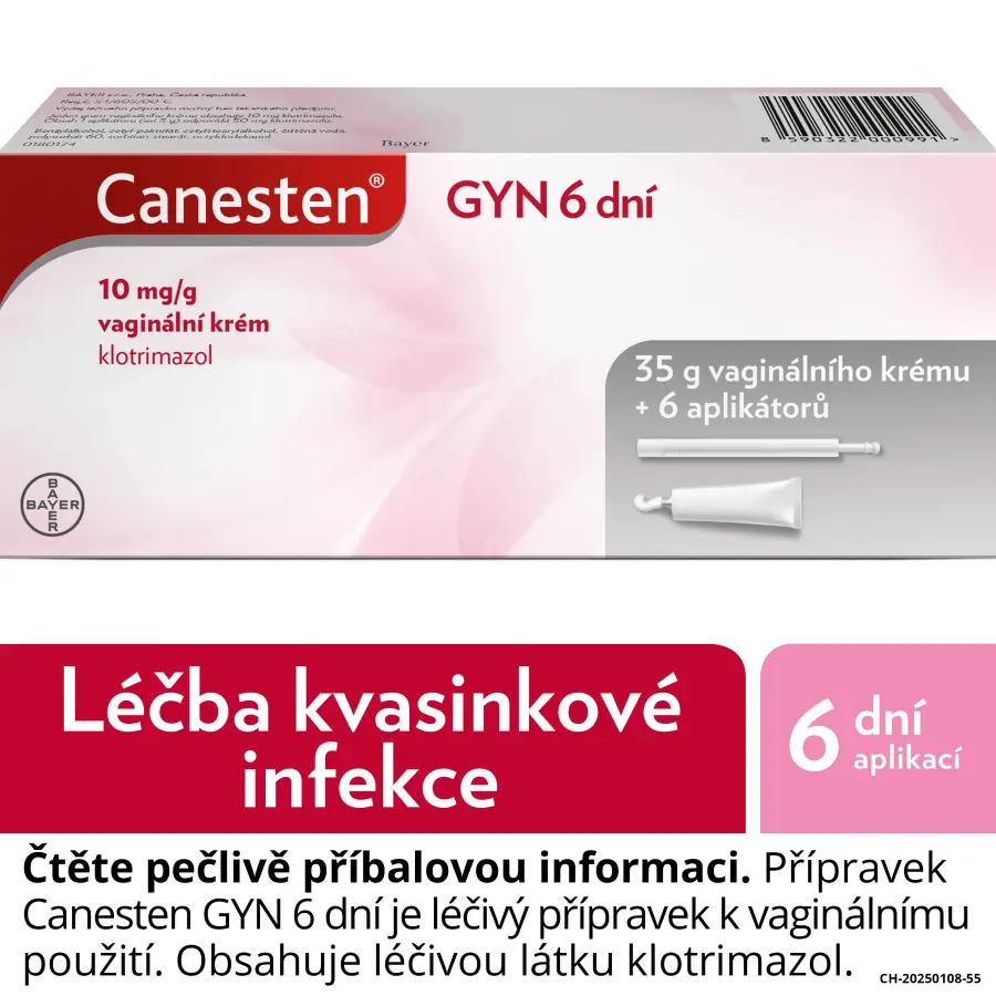Léčivý přípravek Canesten GYN 6 dní je určen k léčbě vaginální kvasinkové infekce a tím ulevuje od pocitu svědění a pálení, výtoku a zarudnutí. Je vhodný pro ženy, které preferují kontinuální léčbu vaginální kvasinkové infekce. Krém se zavádí do pochvy pomocí přiložených aplikátorů (6 kusů). Je vhodný také na léčbu vnějších příznaků kvasinkové infekce nebo k přeléčení partnera i v případě, že nemá příznaky kvasinkové infekce (kvasinkové balanitidy). Ke kvasinkové infekci u žen často dochází v případě, kdy je narušena mikrobiální rovnováha poševního prostředí a není možné udržet pod kontrolou počet přítomných kvasinek (nejčastěji Candida albicans).Vaginální mykóza může být nepříjemná (pálení, svědění a výtok), ale ve většině případů je poměrně jednoduše léčitelná.