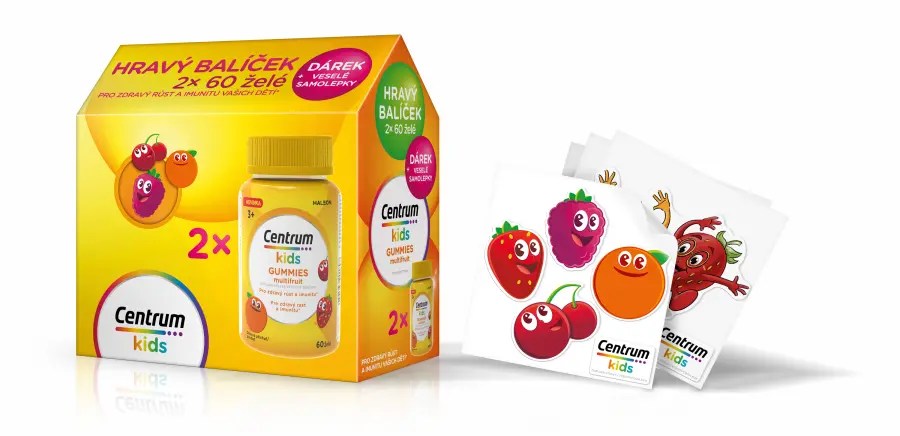 Centrum Kids Gummies multivitamín je žvýkací želé s pomerančovou, třešňovou, jahodovou a malinovou příchutí. Produkt je vhodný pro děti od 3 let.