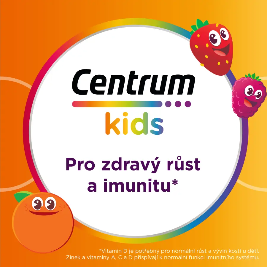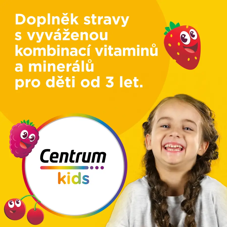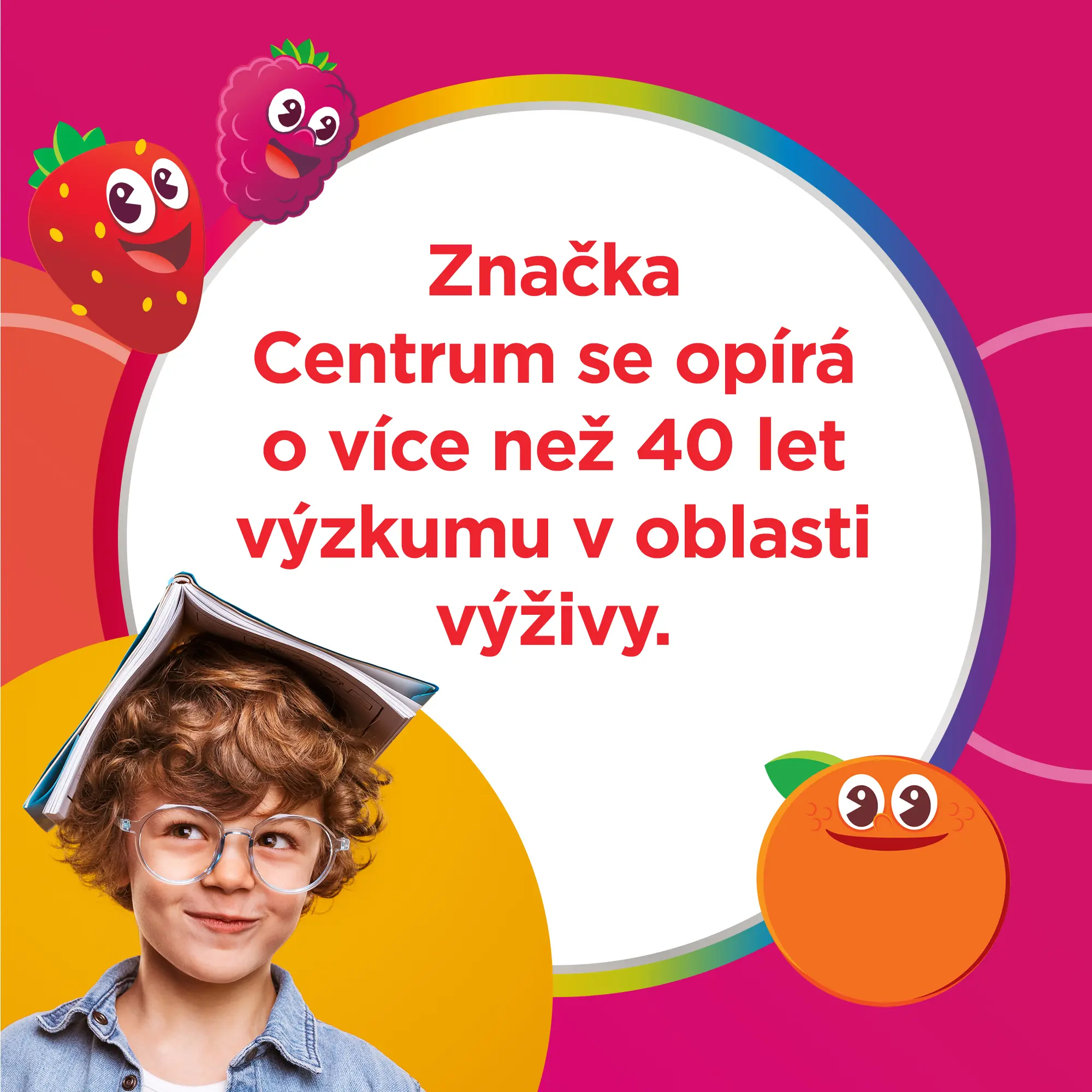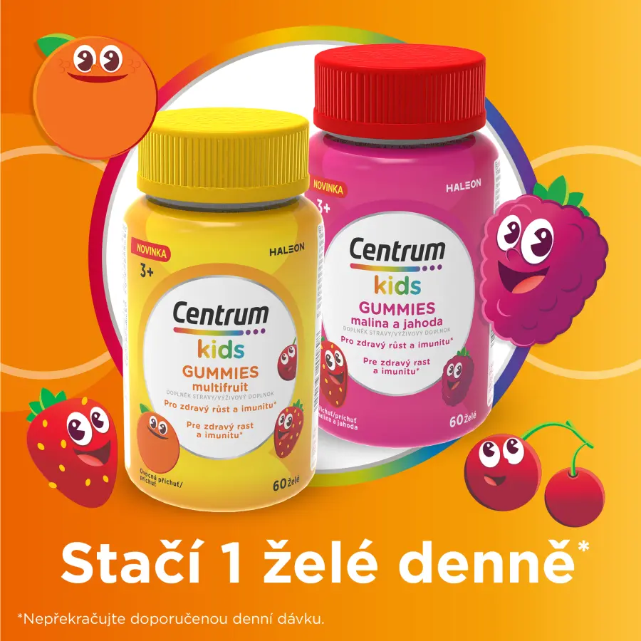 Centrum Kids Gummies multivitamín pro děti multifruit želé je doplněk stravy s komplexem vitamínů, jódem a zinkem, které přispívají k normální funkci imunitního systému, vhodné pro děti od 3 let.