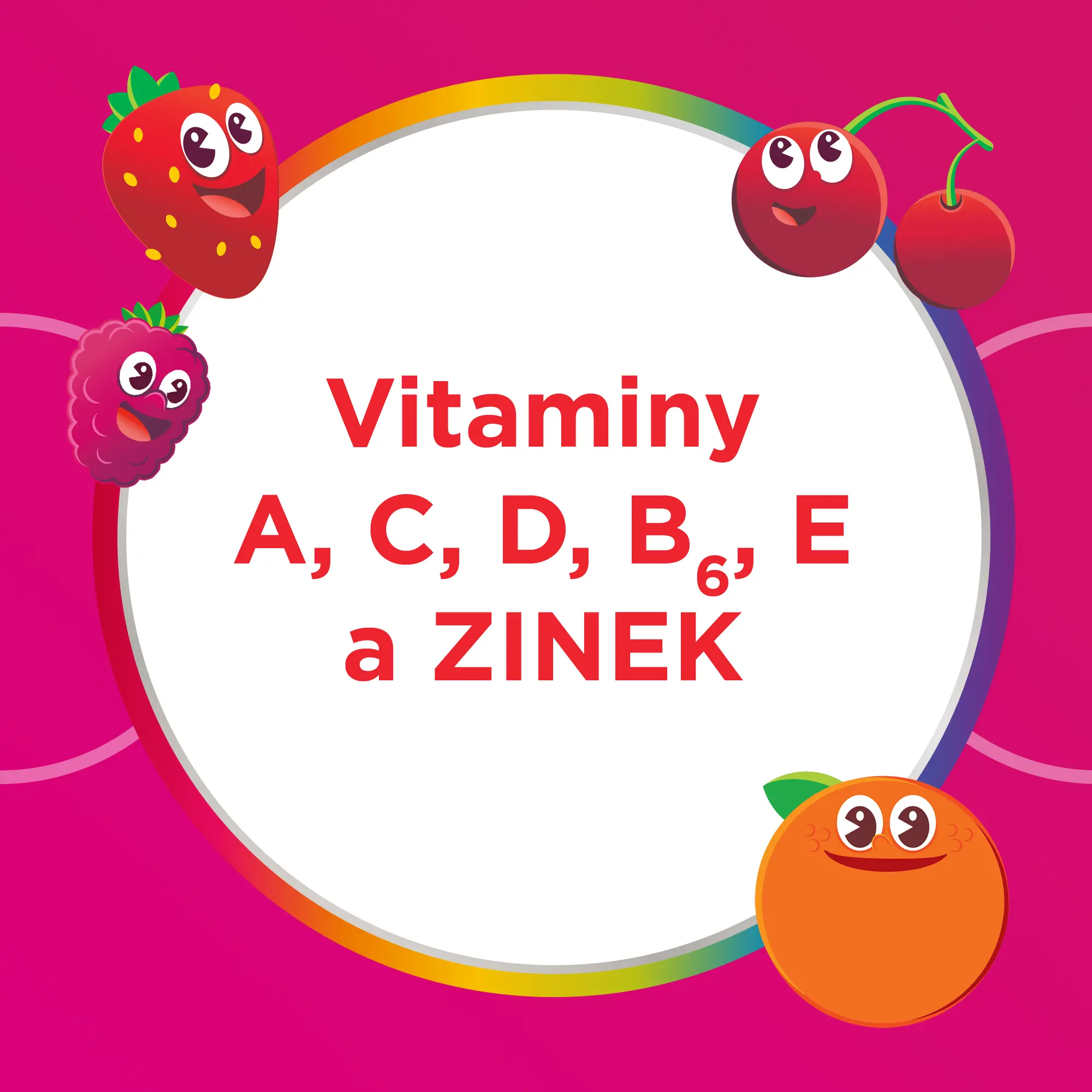 Glukózový sirup; cukr; želatina; vitamin C (kyselina L-askorbová); regulátor kyselosti (kyselina citronová); nikotinamid; maltodextrin; vitamin E (DL-α-tokoferyl-acetát); síran zinečnatý; potravinové barvivo (koncentrát z mrkve a černého rybízu, ředkve, světlice barvířské, černé mrkve, třešně); přírodní aromata (pomerančové, třešňové, jahodové, malinové); rostlinné oleje (kokosový, řepkový); vitamin B6 (pyridoxin-hydrochlorid); vitamin A (retinyl-acetát); lešticí látky: karnaubský vosk, včelí vosk; jodid draselný; biotin (D-biotin); vitamin D (cholekalciferol); vitamín B12 (kyanokobalamin).