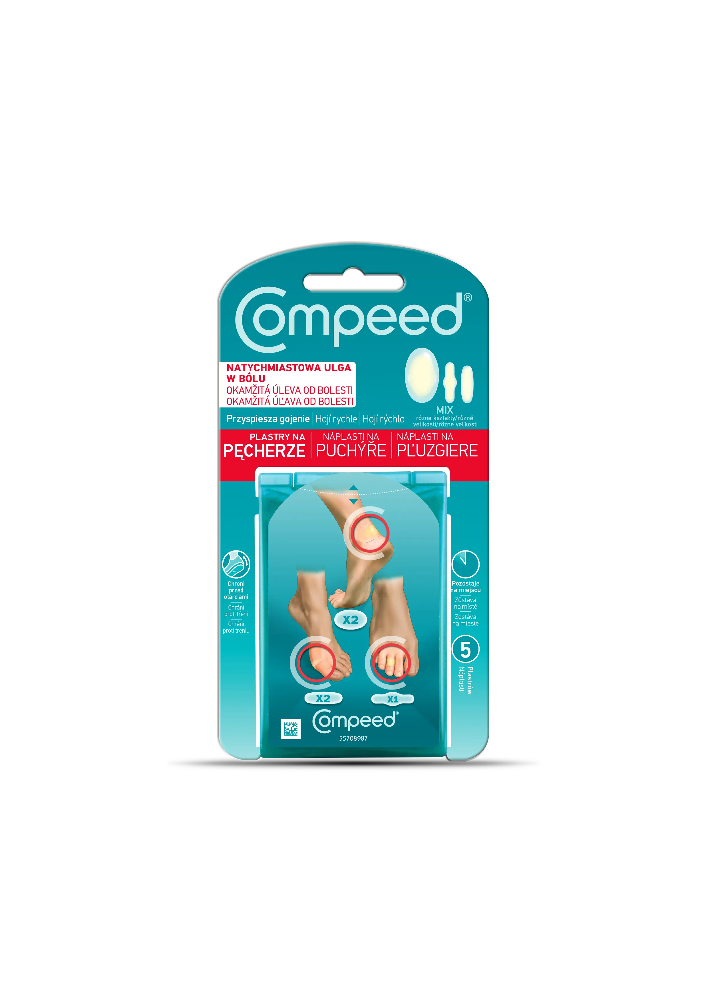 COMPEED® hydrokoloidní náplasti na puchýře jsou účinné v jakékoli fázi vývoje puchýře. Vhodné k použití jak při prvních příznacích tření k prevenci vzniku puchýřů, tak i na již existující puchýře pro úlevu od bolesti a urychlení hojení. Hydrokoloidní technologie je ideální pro léčení puchýřů, ať už jsou způsobeny během, novými botami, opětovnému nošením bot po delší době nebo zkrátka celodenní chůzí. Compeed je jedničkou v ošetřování puchýřů, díky čemuž pomáhá miliónům zákazníků po celém světě.