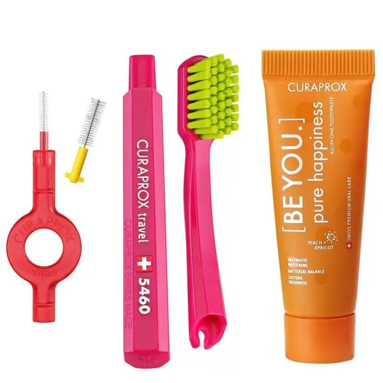 Praktické pouzdro obsahuje pomůcky pro každodenní péči o zuby a dásně. Travel set je k dispozici ve více barevných kombinacích.
