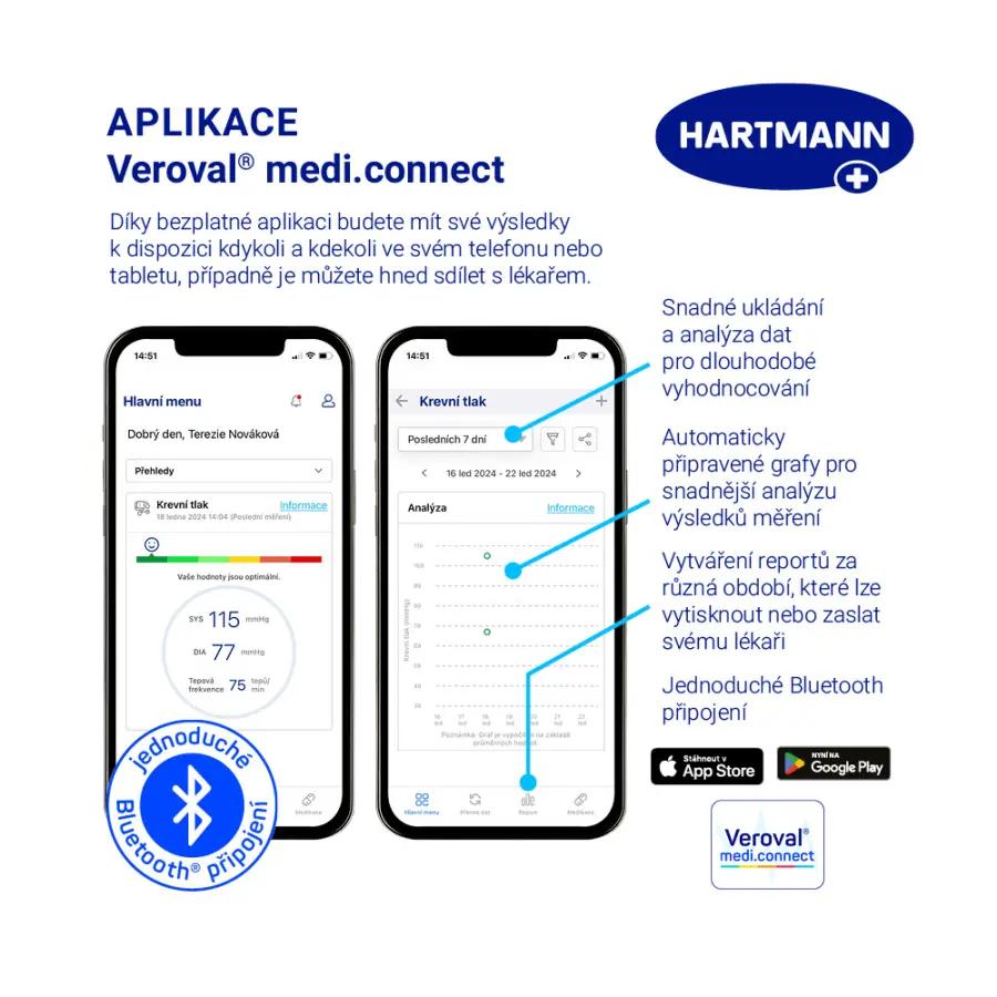 Mějte naprostý přehled o svých měřeních ať jste kdekoli. Tlakoměr Veroval compact + connect můžete prostřednictvím Bluetooth připojení spárovat s vaším chytrým telefonem nebo tabletem s nainstalovanou aplikací Veroval medi.connect. Ta je k dispozici zdarma pro zařízení s operačním systémem Android nebo iOS. V aplikaci uvidíte výsledky vašich měření v přehledných grafech a své výsledky klidně můžete odeslat e-mailem lékaři. Do aplikace lze přidat i informace o užívaných prášcích nebo si nastavíte upomínky pro pravidelná měření.