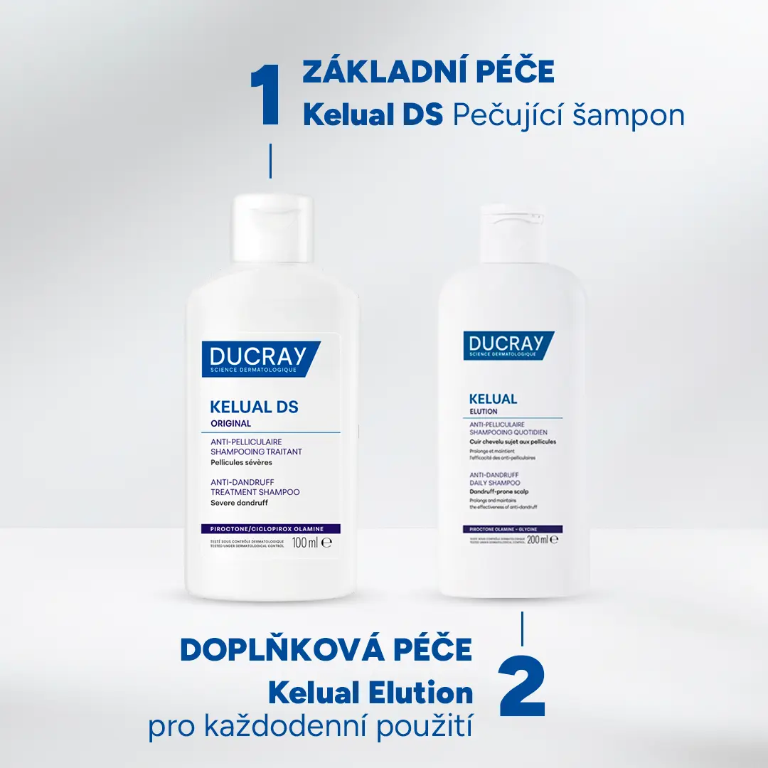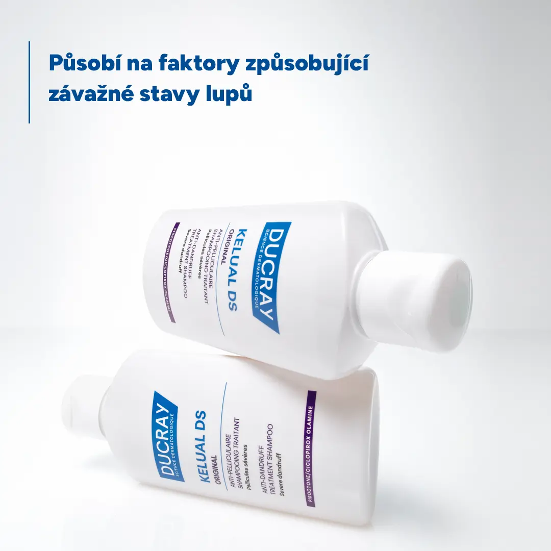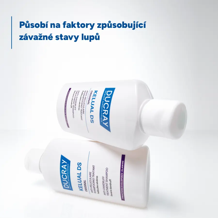 Kelual DS pečující šampon proti lupům a jejich opakovanému návratu je určený pro péči o závažné a recidivující formy lupů se začervenalou a svědící vlasovou pokožkou a vlasovou pokožku trpící seboroickou dermatitidou. Již od prvního použití zklidňuje svědění vlasové pokožky, zmírňuje začervenání, odstraňuje lupy a zároveň brání jejich opakovanému návratu. Jeho komplexní složení obsahující čisticí a doplňkové aktivní látky působí proti všem faktorům zodpovědným za výskyt závažných stavů lupů.