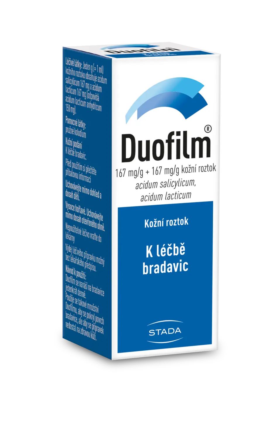Duofilm je kožní roztok k místnímu použití k léčbě bradavic. Přípravek Duofilm se používá k léčbě bradavic u dospělých, dospívajících a dětí starších dvou let. Bradavice je virové onemocnění v povrchové vrstvě kůže (drobný kožní výrůstek vzniklý růstem buněk pokožky). Doba mezi nákazou a projevem onemocnění (vznikem bradavice) je různá, od několika týdnů až po několik měsíců. Bradavice se mohou přenášet kontaktem viru s porušenou kůží, zvláště tam, kde je teplo a vlhko. To je důvod, proč jsou jedním z nejčastějších zdrojů infekce plavecké bazény. Použití přípravku Duofilm vede ke kontrolovanému rozrušení keratinu (vrstvy tuhé hrubé kůže na povrchu bradavice). Proto se přípravek smí používat pouze na bradavice.