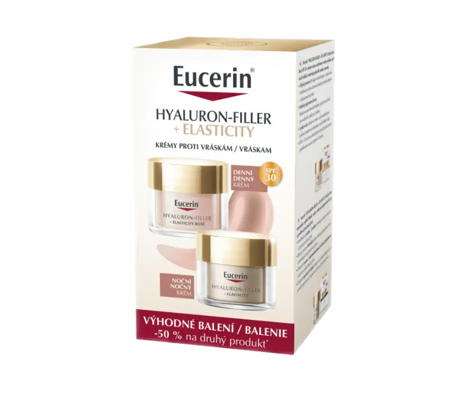 Eucerin Hyaluron-filler+Elasticity denní krém Rosés obsahem SPF30 a UVA filtrem, brání předčasnému stárnutí a prohlubování vrásek, které způsobuje UV záření. Díky svému jemně růžovému nádechu pleť ráno rozjasní a dodá ji svěží vzhled. Obsahuje kyselinu hyaluronovou, která vyplní vrásky a thiamidol, který snižuje vznik stařeckých skvrn. Pleť bude pružnější, díky účinné kombinaci arktiinu a kreatinu, která obnovuje produkci kolagenu.