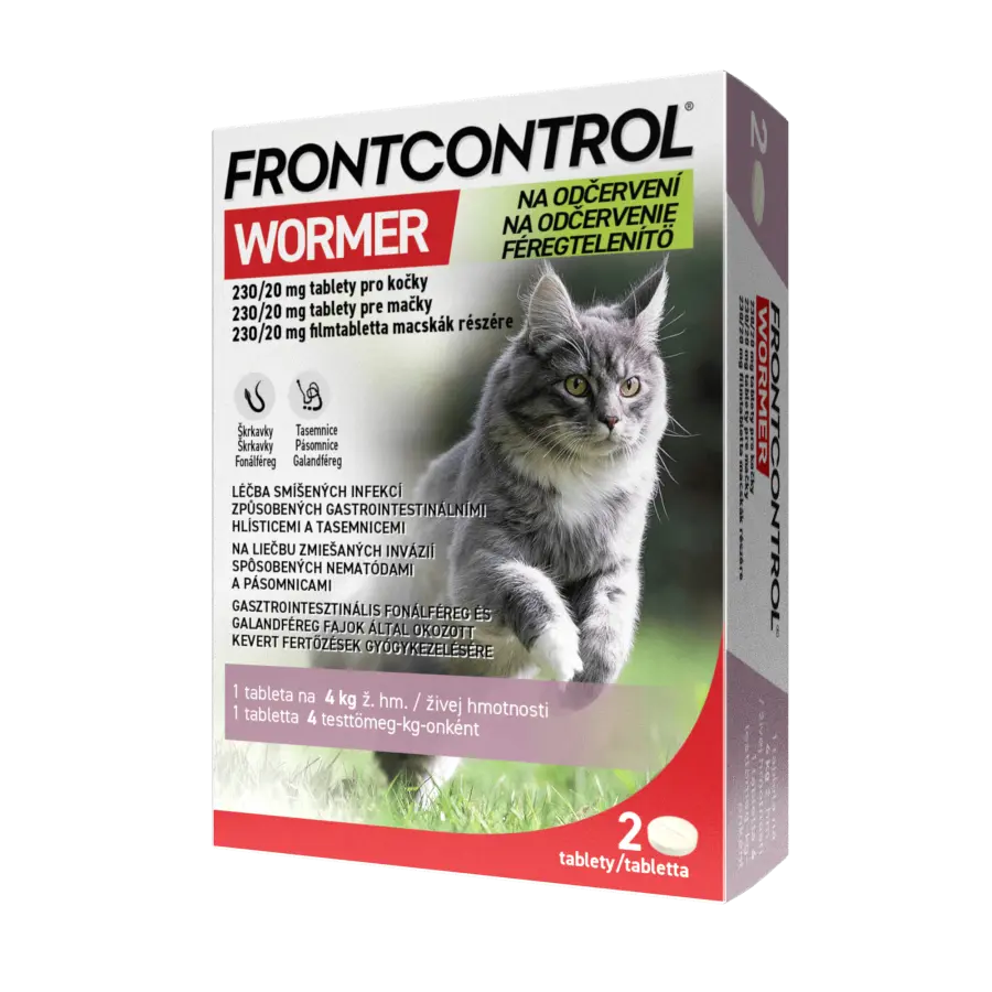 Frontcontrol Wormer 230/20mg pro kočky jsou chucené tablety na odčervení koček proti vnitřním parazitům. Tablety s masovou příchutí hubí tasemnice a škrkavky. Tableta je rozdělena rýhou pro snadné dělení.
