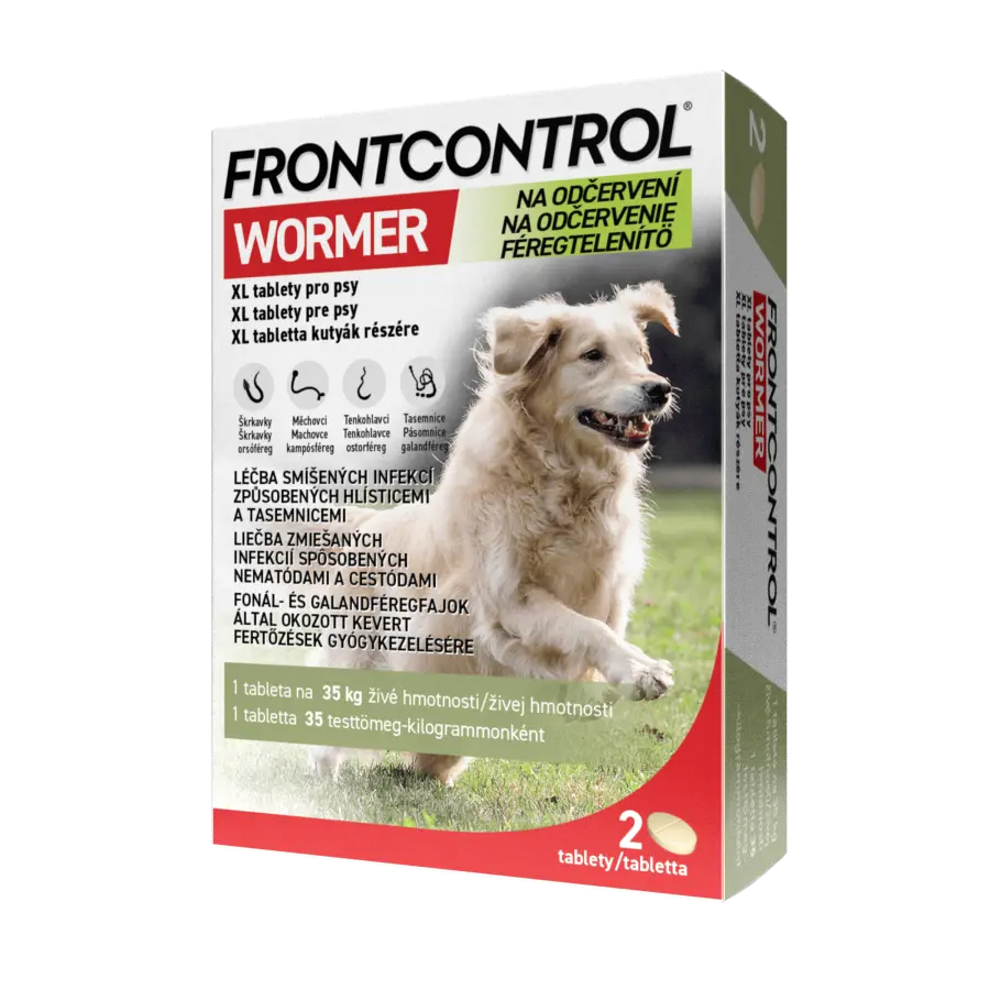 Frontcontrol Wormer pro psy XL jsou ochucené tablety na odčervení psů proti vnitřním parazitům. Tablety s masovou příchutí hubí tasemnice, škrkavky a další parazity. Tableta je rozdělena rýhou pro snadné dělení.