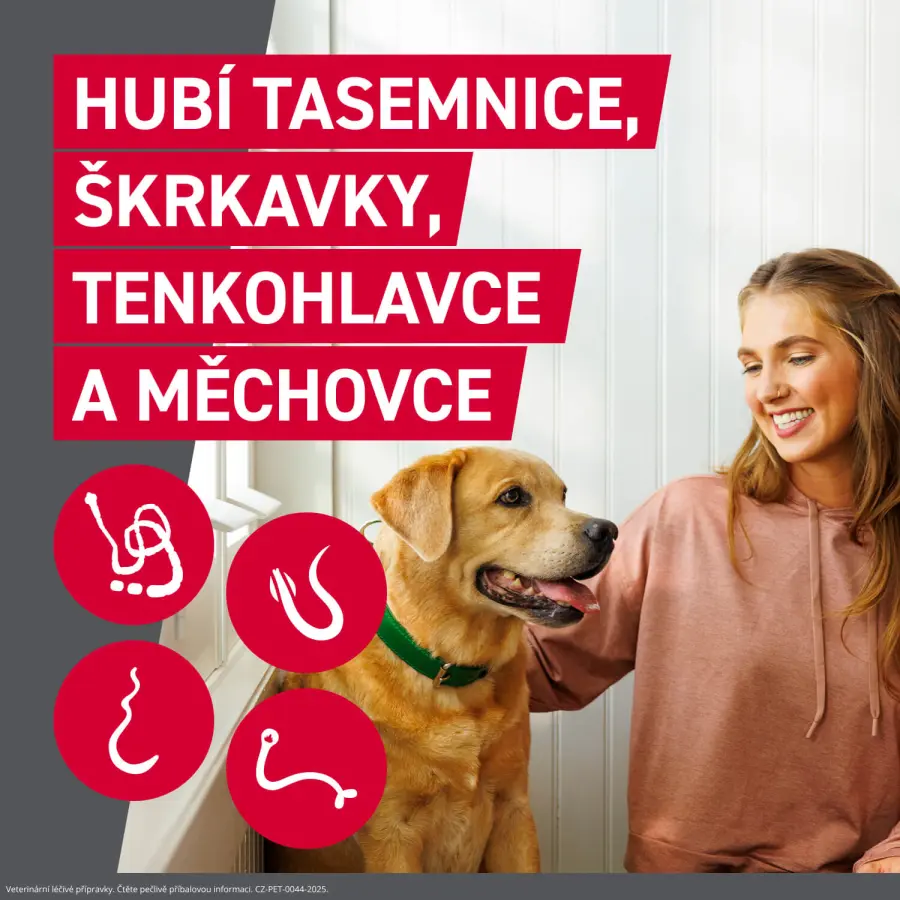 Léčivé látky: Praziquantelum 175 mg, Pyranteli embonas 504 mg (což odpovídá 175 mg pyrantelum) a Febantelum 525 mg.