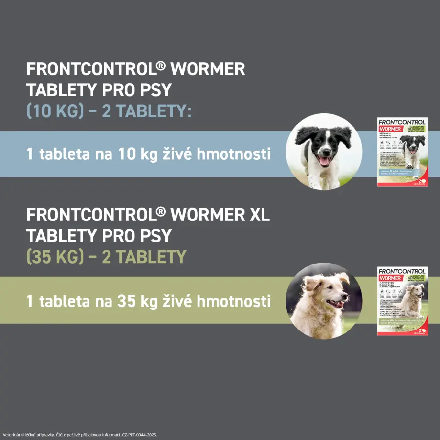 Živá hmotnost kg/počet tablet: Zhruba 17,5 kg/ 0,5 Frontcontrol Wormer XL tablety , 31-35 kg/ 1 Frontcontrol Wormer XL tablet, 36-40 kg/ 1 Frontcontrol Wormer XL tableta plus 0,5 Frontcontrol Wormer tablety, 41-45 kg/ 1 Frontcontrol Wormer XL tableta plus 1 Frontcontrol Wormer tablet, 46-50 kg/ 1 Frontcontrol Wormer XL tableta plus 1,5 Frontcontrol Wormer tablety, 51-55 kg/ 1 Frontcontrol Wormer XL tableta plus 2 Frontcontrol Wormer tablety, 56-60 kg/ 1 Frontcontrol Wormer XL tableta plus 2,5 Frontcontrol Wormer tablety, 61-65 kg/ 1 Frontcontrol Wormer XL tableta plus 3 Frontcontrol Wormer tablety, 66-70 kg/ 2 Frontcontrol Wormer XL tablet.