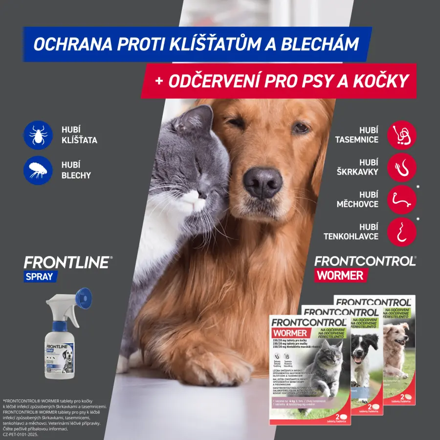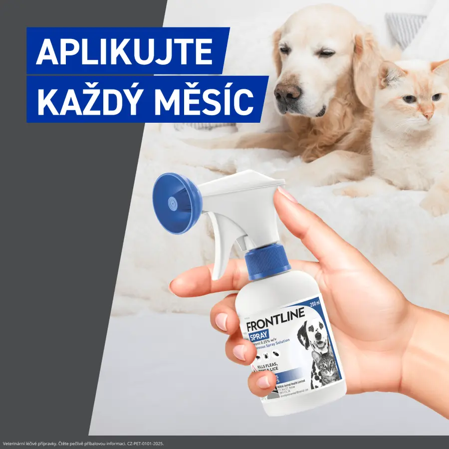 Frontline spray je antiparazitární přípravek ve spreji na ochranu psů a koček proti blechám a klíšťatům. Přípravek je účinný po dobu až 5 týdnů proti klíšťatům, 1 až 3 měsíce proti blechám a 63 dnů (psi) nebo 42 dnů (kočky) proti všenkám.