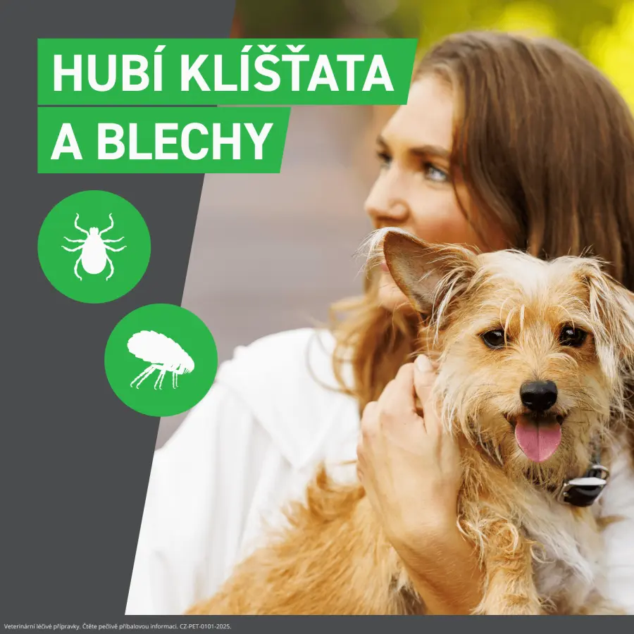 K léčbě a prevenci proti napadení blechami, a to pouze blechami nebo blechami spolu s klíšťaty či všenkami.