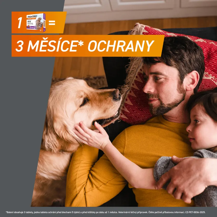 Frontpro 136mg 25-50kg 3 žvýkací tablety je vysoce účinný přípravek určený pro psy vážící mezi25-50kg, který pomáhá chránit vašeho mazlíčka před klíšťaty a blechami.Díky svému složení a dávkování ve formě tří žvýkacích tablet poskytujeFrontpro rychlou ochranu, která působí až po dobu 12 týdnů. Navíc, díkysnadnému užití a chutné příchuti, jsou tyto tablety skvělým způsobem,jak zajistit, aby váš pes zůstal zdravý a šťastný. S Frontpro můžete mítjistotu, že váš pes bude ochráněn před nebezpečím klíšťat a blech, a tos minimálním úsilím a maximálním efektem.