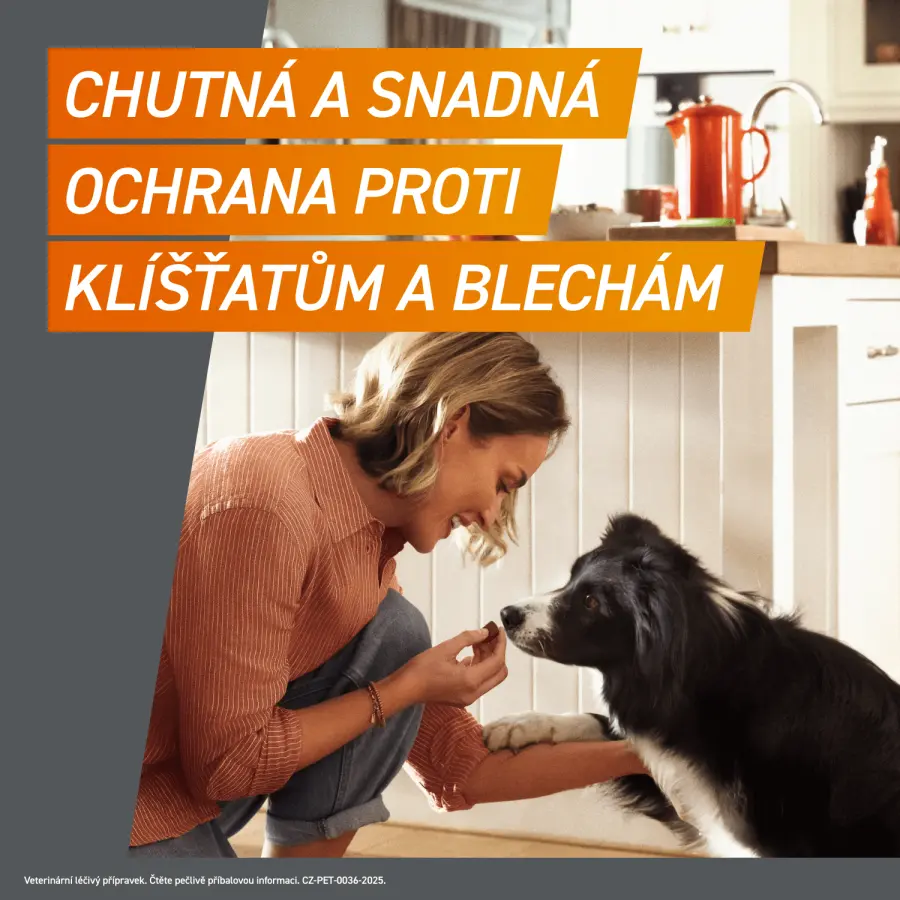 Chutné antiparazitární tablety ochrání vašeho psa před klíšťaty a blechami na 3 měsíce*. Pro psy o hmotnosti 10-25kg.