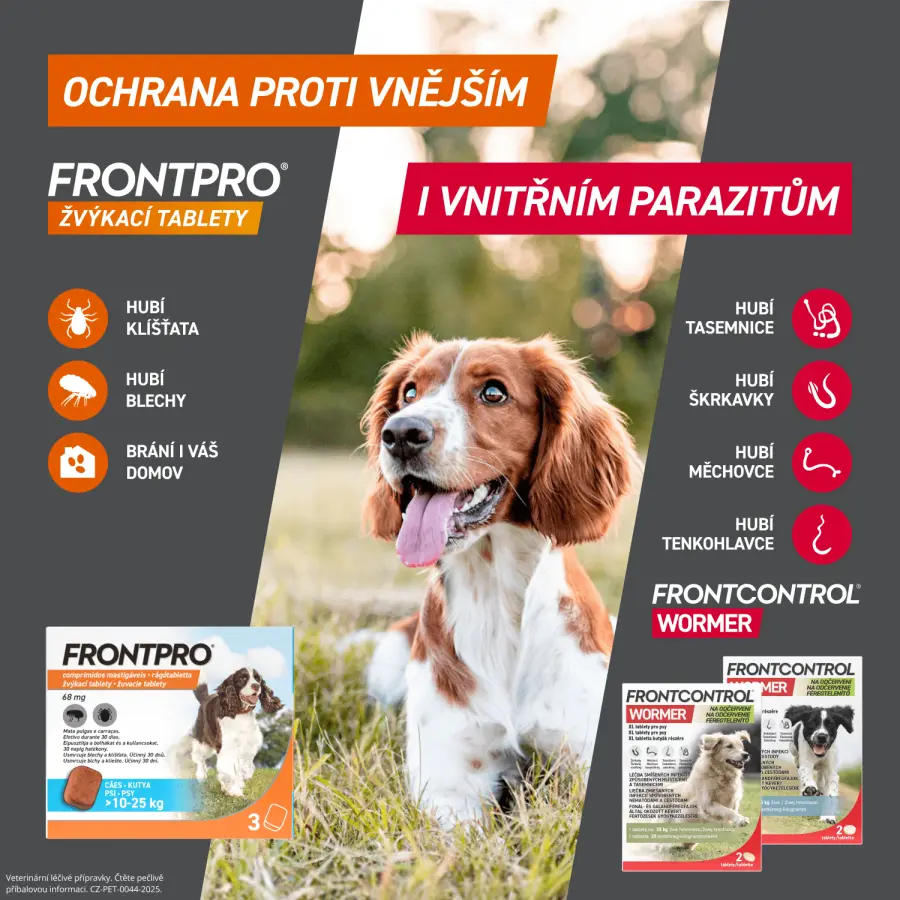 FRONTPRO® je bezpečné a účinné u nejrůznějších plemen psů (včetně kolií). Může být podáváno štěňatům od 8 týdnů věku, pokud váží alespoň 2 kg. Používejte opatrně u psů s epilepsií nebo jinou záchvatovou poruchou. Máte-li jakékoli obavy, obraťte se na svého veterináře.