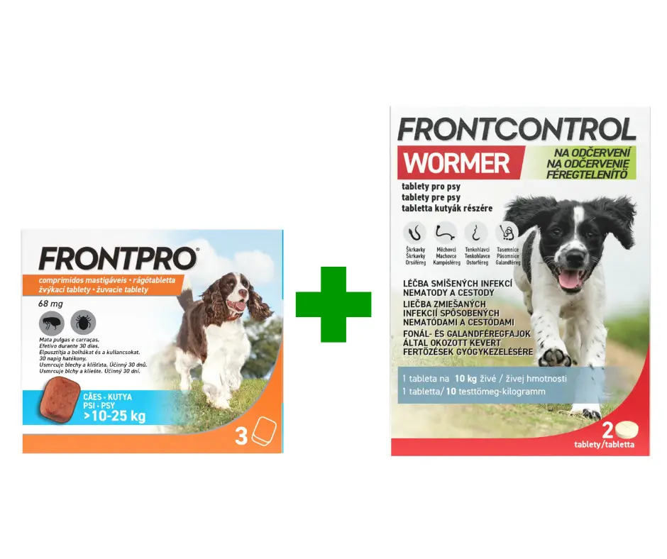 Frontpro 68mg 10-25kg + Frontcontrol Wormer pro psy je výhodná sada pro ochranu psů. Tato výhodná sada je ideální volbou pro majitele psů, kteří chtějí zajistit komplexní ochranu svých mazlíčků před parazity. Obsahuje Frontpro 68mg 10-25kg 3 žvýkací tablety (pro psy 10-25 kg) a Frontcontrol Wormer 2 ochucené tablety na odčervení psů.