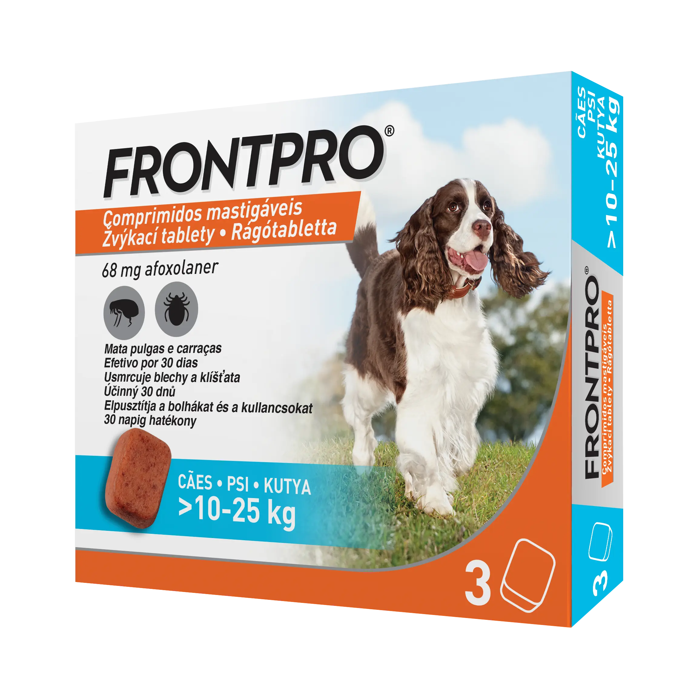 Frontpro 68mg je veterinární přípravek určený pro psy o váze 10-25 kg. Každé balení obsahuje 3 žvýkací tablety s dávkou 68 mg účinné látky. Jedna tableta poskytuje ochranu proti klíšťatům a blechám po dobu jednoho měsíce. Frontpro eliminuje klíšťata do 48 hodin a dospělé blechy do 8 hodin po napadení.
