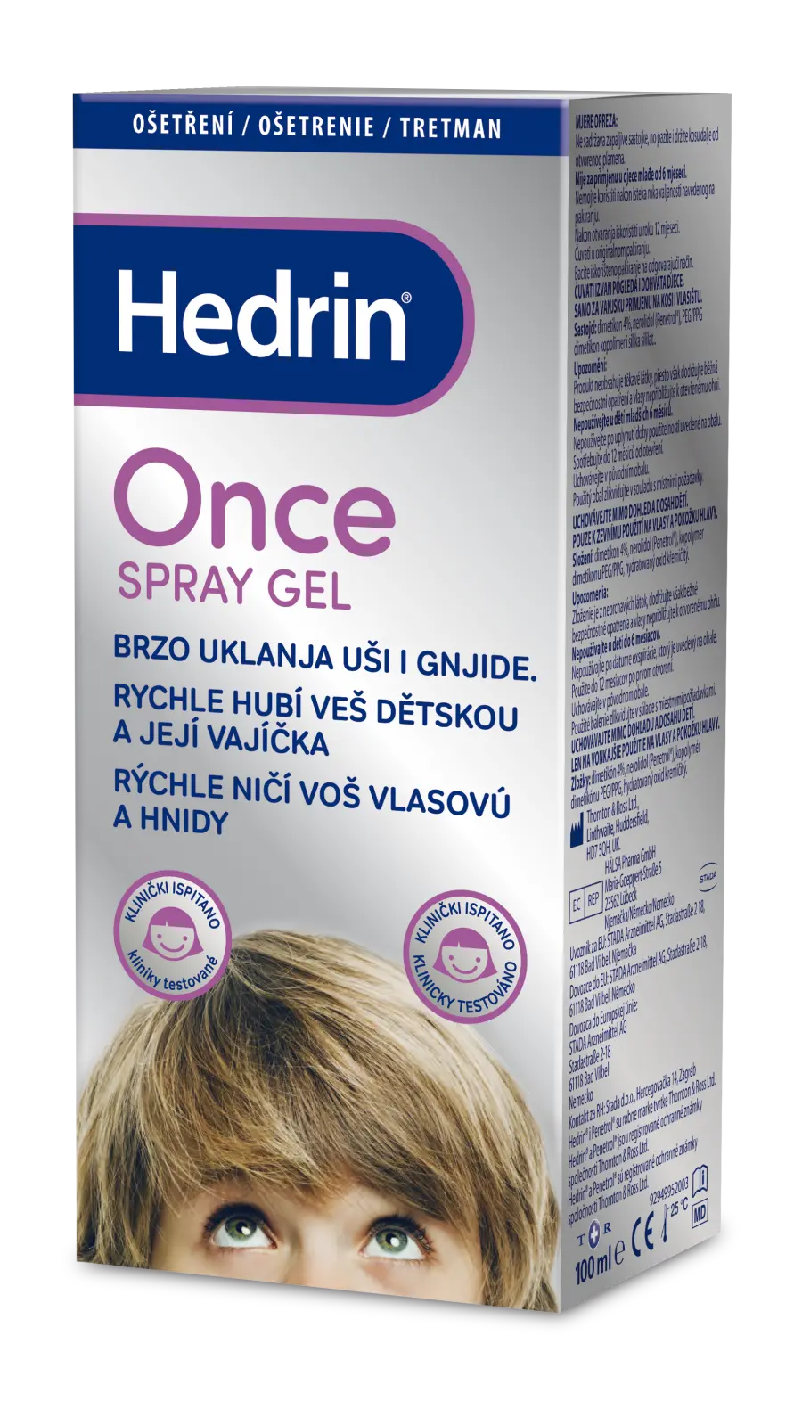 Hedrin Once Spray Gel je gelový přípravek ve spreji - vysoce účinný přípravek proti vším a jejich vajíčkům. Mechanický rozprašovač pomáhá snadno nanést gel na hlavu a vlasy, včetně těžko dostupných míst. Funguje na principu fyzického zadušení vší a také obsahuje Penetrol®, který pomáhá produktu proniknout do vajíček vší a zahubit je.