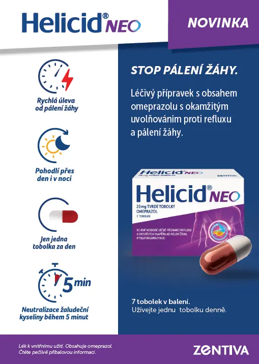 Helicid Neo 20 mg tvrdé tobolky obsahují omeprazol, který snižuje množství kyseliny v žaludku a pomáhá zmírnit příznaky refluxu, jako je pálení žáhy a kyselá regurgitace