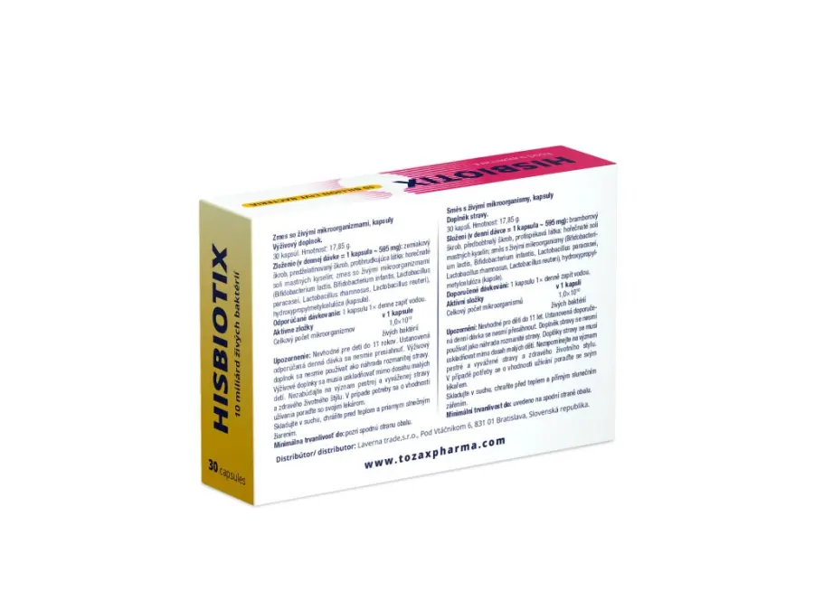 Hisbiotix je směs s živými mikroorganismy s všestranným využitím. Pomáhá odstranit zažívací potíže, průjem nebo naopak zácpu, nadýmání apod. Probiotika Hisbiotix jsou vhodná i pro osoby s intolerancí laktózy.