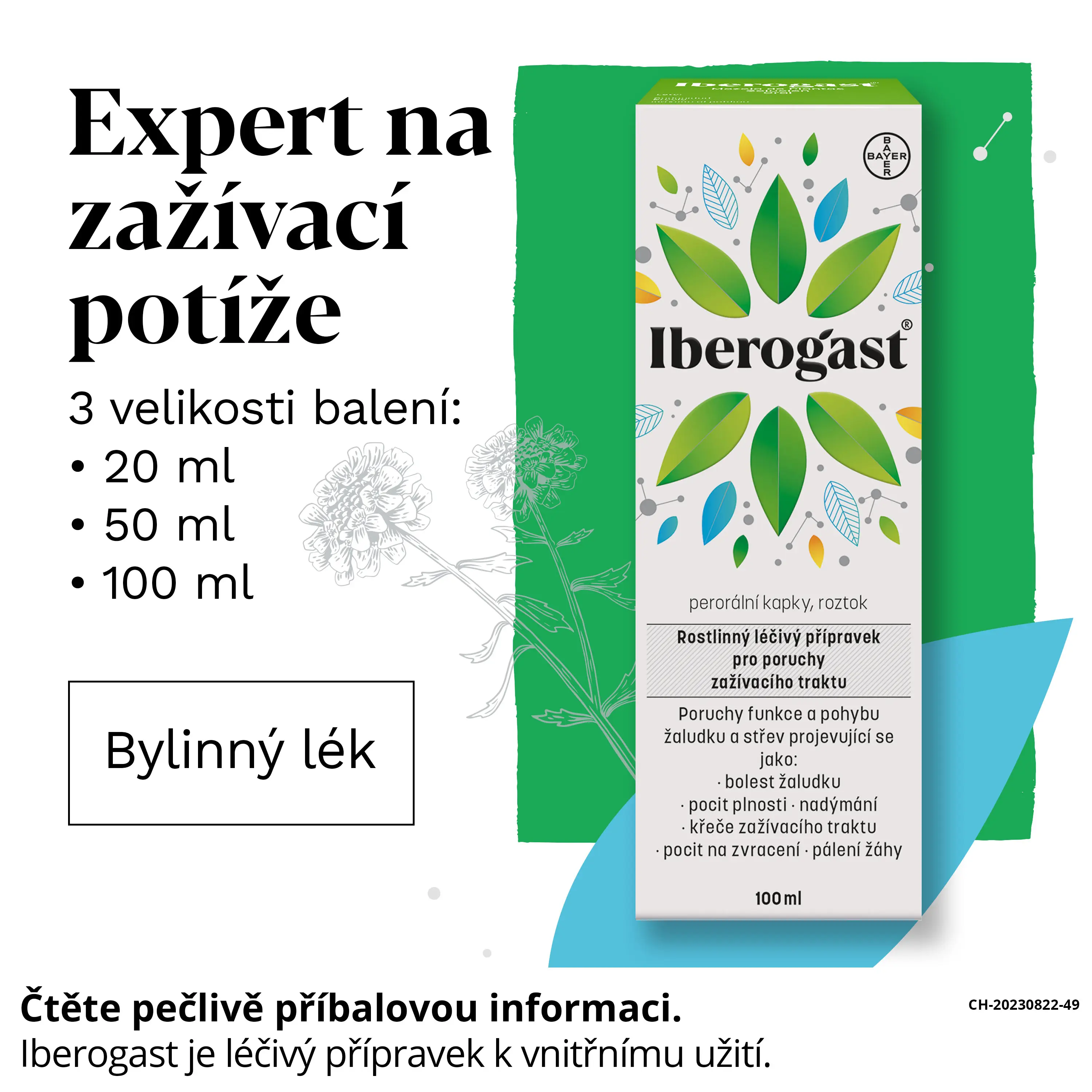 Lék Iberogast® efektivně uleví od různých zažívacích potíží. Jeho komplexní účinek pramení z vyváženého obsahu výtažků z různých částí 9 bylin (iberky hořké, anděliky lékařské, ostropestřce mariánského, máty peprné, kmínu kořenného, heřmánku pravého, meduňky lékařské, lékořice lysé a vlaštovičníku většího). Díky svému unikátnímu složení je vhodný jak pro poruchy funkce a pohybu střev tak i žaludku. Účinně tak ulevuje od celé řady symptomů, jakými jsou například bolest břicha, křeče v břiše, nadýmání, bolesti žaludku nebo nevolnost.