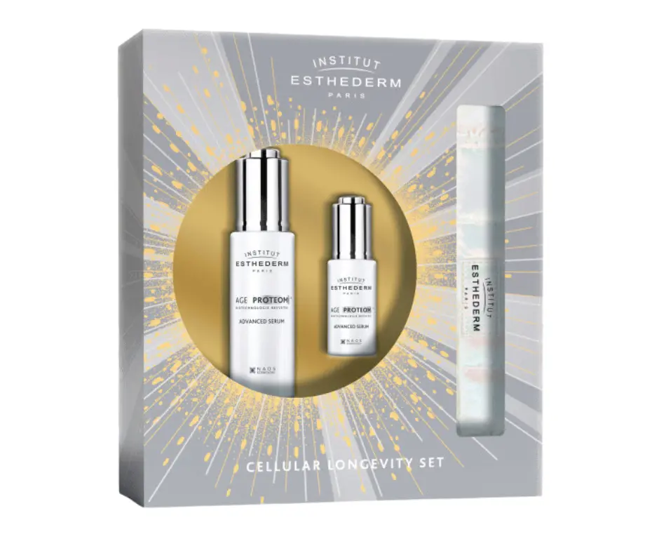 Dárková seda Institut Esthederm Age Proteom obsahuje ikonické duo sér dlouhověkosti buněk. Jde o unikátní sérum s pokročilou biotechnologií a efektem chaperonů, která trvale uchovává a opětovně posiluje klíčové proteiny v pleti a chrání ji tak před předčasným stárnutím. Pleťové sérum poskytuje vysokou antioxidační ochranu, doslova biochemický štít, který účinně chrání pleť před oxidačním stresem a škodlivými vnějšími vlivy. Jemná, svěží a hydratační textura séra. Pokožka je po nanesení mimořádně hebká, sérum pomáhá předcházet výskytu tmavých skvrn a rozjasňuje pleť. Sérum má jemnou, stylovou vůni s tóny černé švestky, růže a bílého pižma. Neobsahuje alergeny. Oční sérum doplňuje ikonické sérum Age ProeomTM v cílené péči o oční okolí. Viditelně a dlouhodobě koriguje všechny známky stárnutí očního okolí jako jsou vrásky, otoky, ochablá víčka a tmavé kruhy.